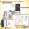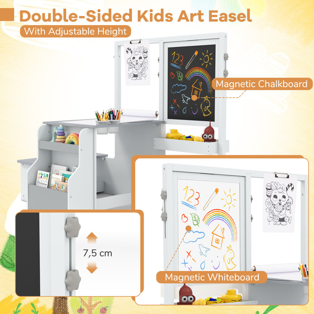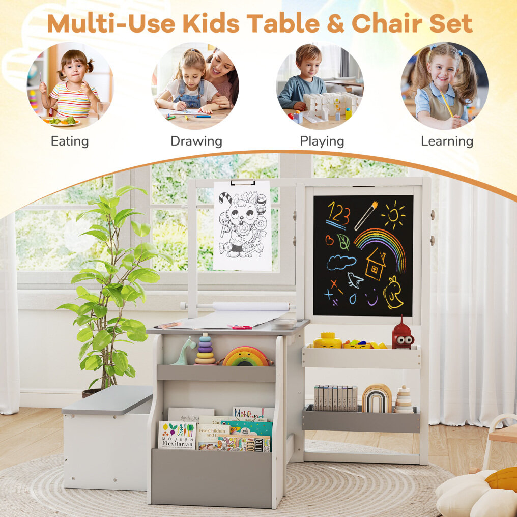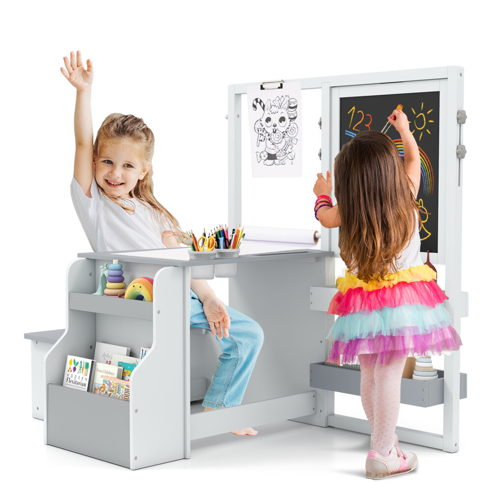 Kids Art Easel Table and Bench Set with Adjustable Easel and Bookshelf-Light Grey