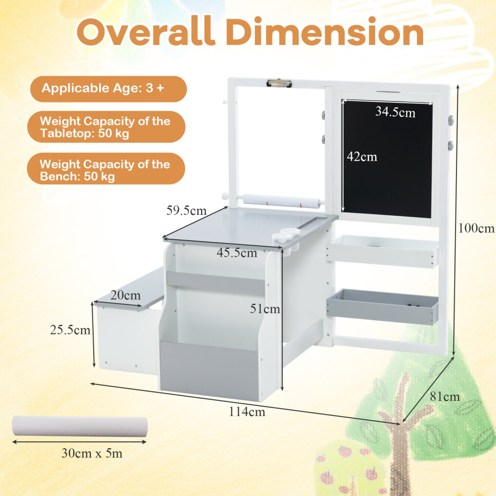 The multifunctional art table and chair set offer a versatile and fun space for children aged 3+ years old. The double-sided art easel has a magnetic whiteboard and a chalkboard for creative drawing. The height-adjustable design makes it suitable for kids of different ages. The wide bench provides a comfortable resting spot for your kids to sit beside the table to read, write or eat. Besides, it features 2 placing trays, 1 handy hanging hook, 1 under bench compartment and 1 bookshelf, encouraging kids to learn to well organize different stuff and develop good habits of timely storage. Additionally, the art centre includes rich art supplies, such as 5 chalks, 2 markers, 2 paint cups, 1 dry eraser and 1 replaceable paper roll. And smooth surface is super easy to wipe clean, saving your time and effort. If you are looking for such a product, do not hesitate to buy it!
