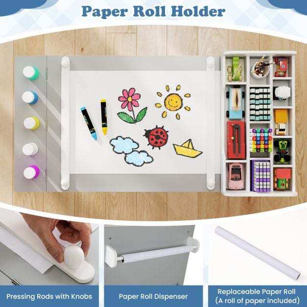 Convenient Paper Roll Dispenser: Integrated directly into the table, the paper roll dispenser holds replaceable paper roll (a roll of paper included) and allows continuous creativity, making it easy for kids to pull out fresh paper whenever inspiration strikes.