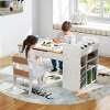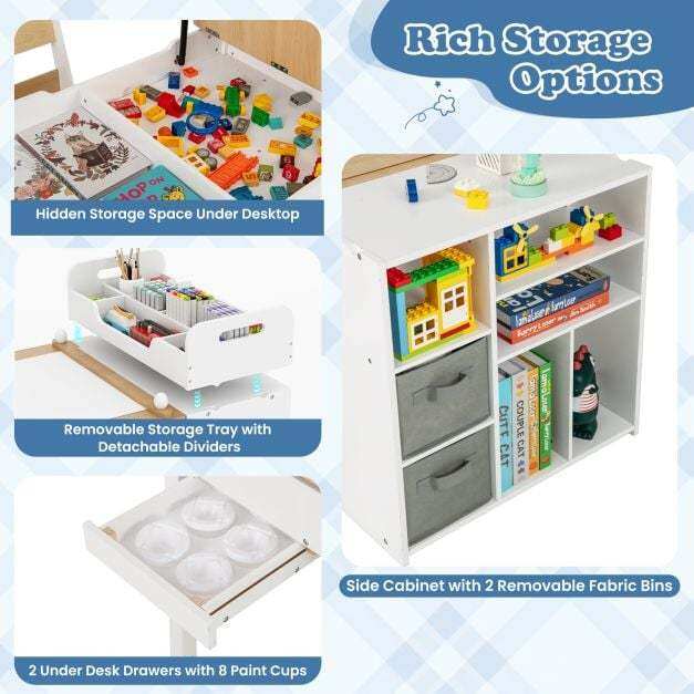 Rich Storage Options: This craft table has a hidden storage space under desktop, a removable storage tray with detachable dividers, a side cabinet with 2 removable fabric bins, and 2 under desk drawers with 8 paint cups, efficiently organizing all your child's art supplies. Table dimension: 120 cm x 60 cm x 60 cm (L x W x H).