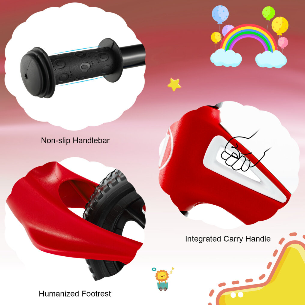 ● Lightweight and Portable Design: The lightweight frame makes sure that this kids balance bike weighs only 5.3 lbs. In addition to an integrated carry handle, the toddler beginner bike can be relocated effortlessly. When not in use, you can hang it to save space with the handle.