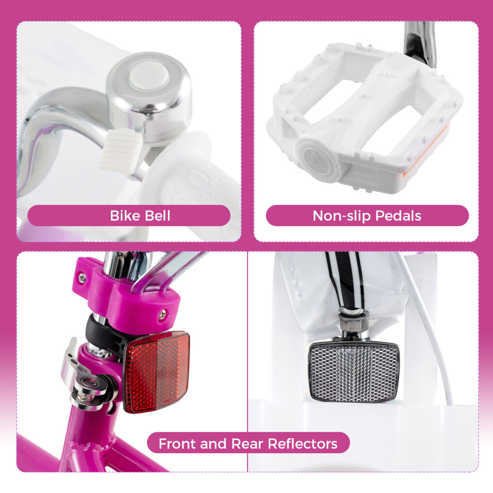 ● Reliable and Child-friendly Bicycle: The strong structure withstands multiple bumps. The front and rear reflectors keep kids visible in low-light conditions, ensuring added safety. The removable training wheels are included to help beginners keep balance and build their confidence. A convenient kickstand (only for 18-inch bikes) makes it easy to park.