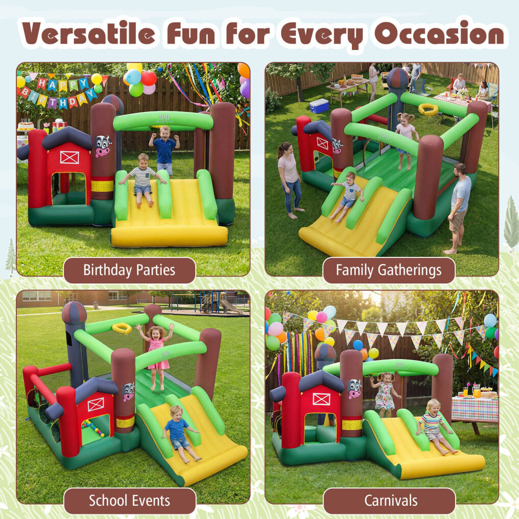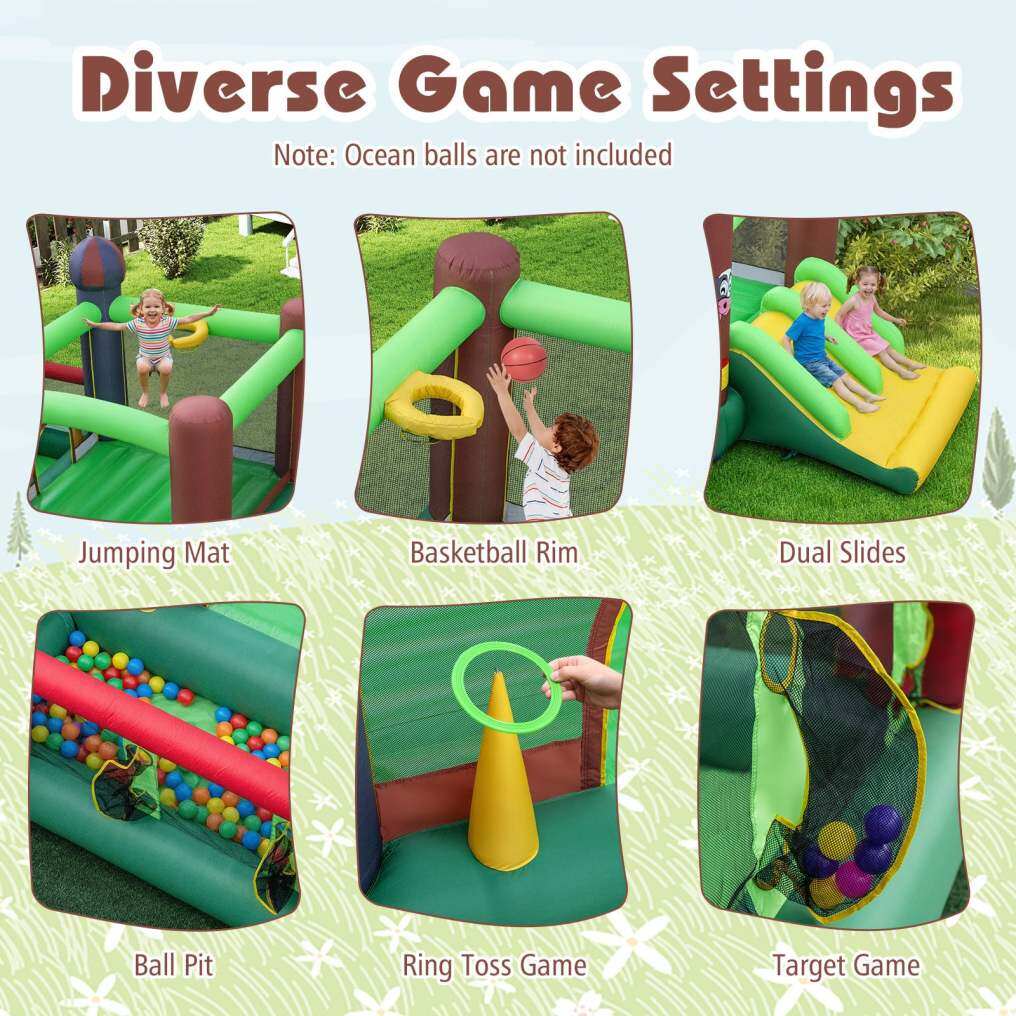 ● Jumping mat, dual slides, and ball pit to keep kids entertained
