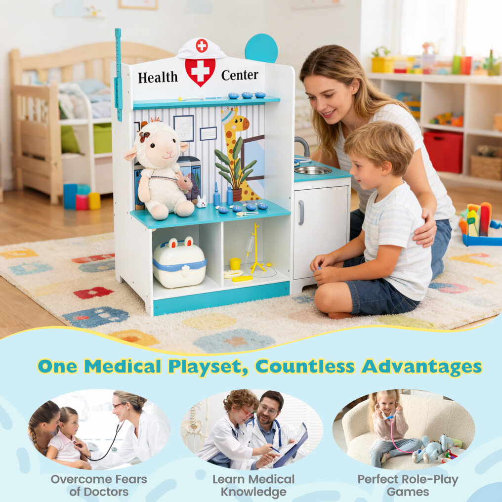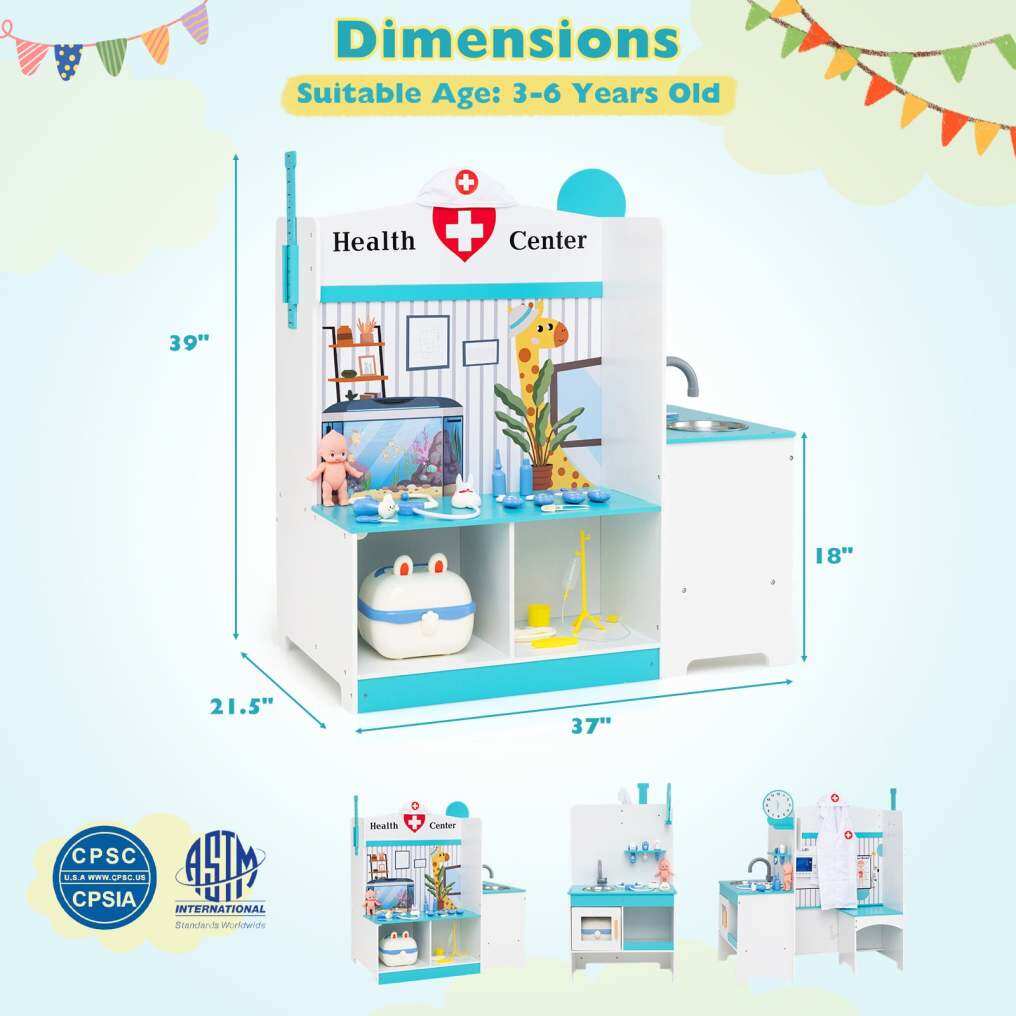 ● Easy Storage: Keeping the playroom tidy is effortless thanks to an included carrying case, 2 hanging hooks, open compartments, and a cabinet. Kids learn organization and responsibility as they store all their medical tools after every "shift," ensuring that clean-up is almost as fun as playtime itself.