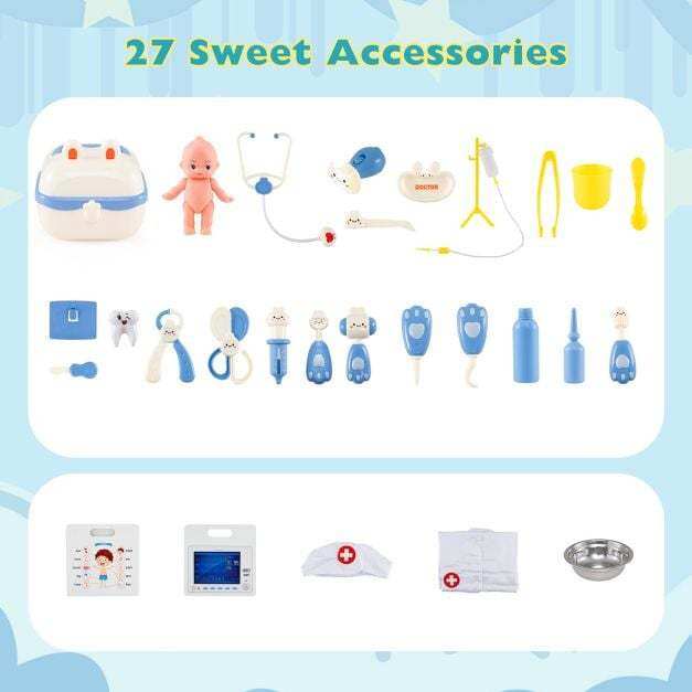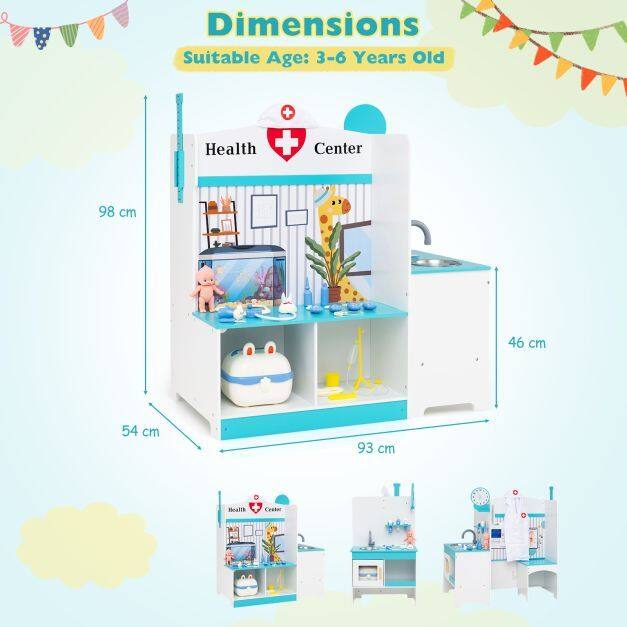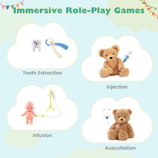 ● Easy Storage: Keeping the playroom tidy is effortless thanks to an included carrying case, 2 hanging hooks, open compartments, and a cabinet. Kids learn organization and responsibility as they store all their medical tools after every "shift," ensuring that clean-up is almost as fun as playtime itself.