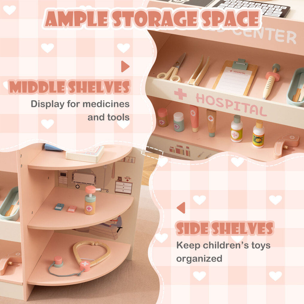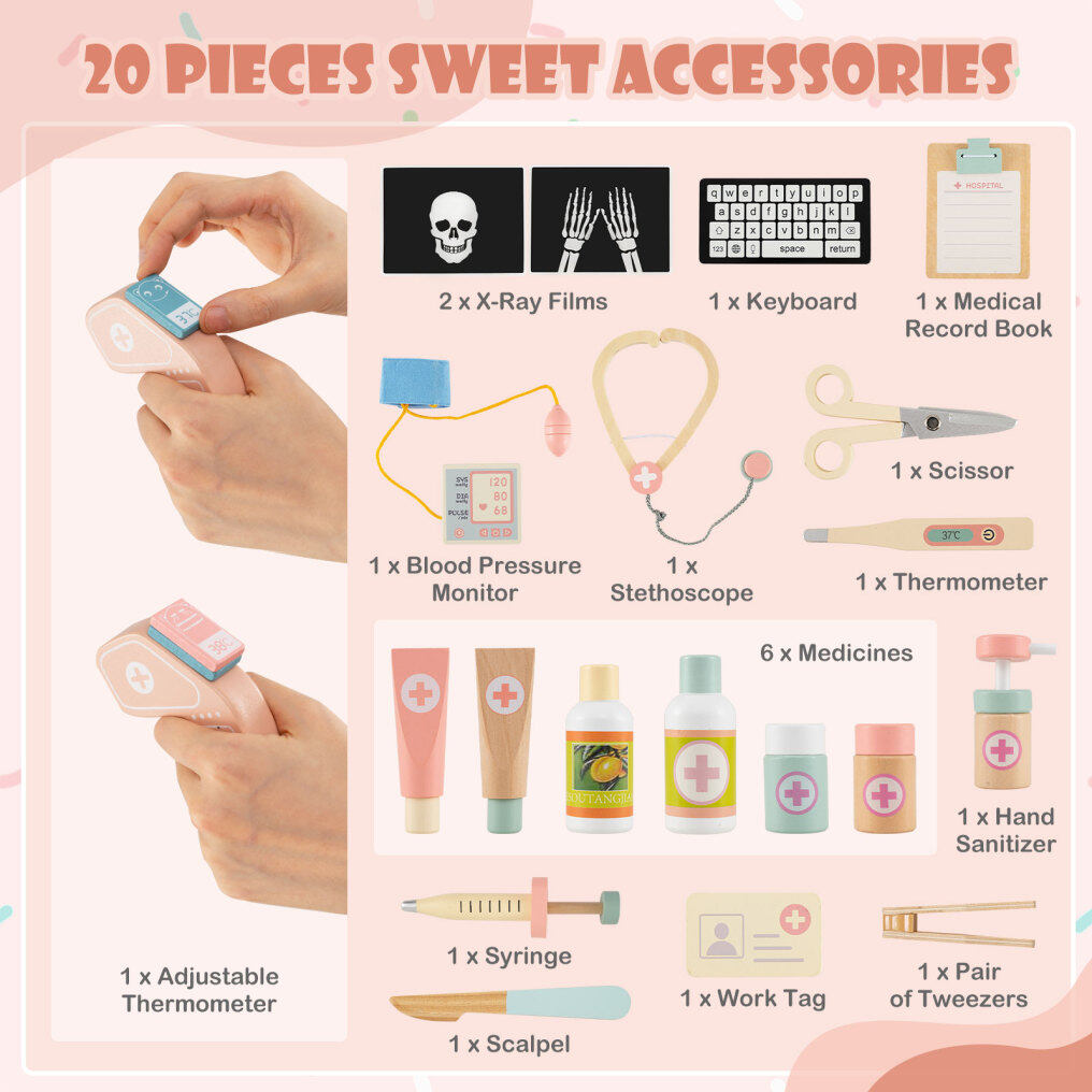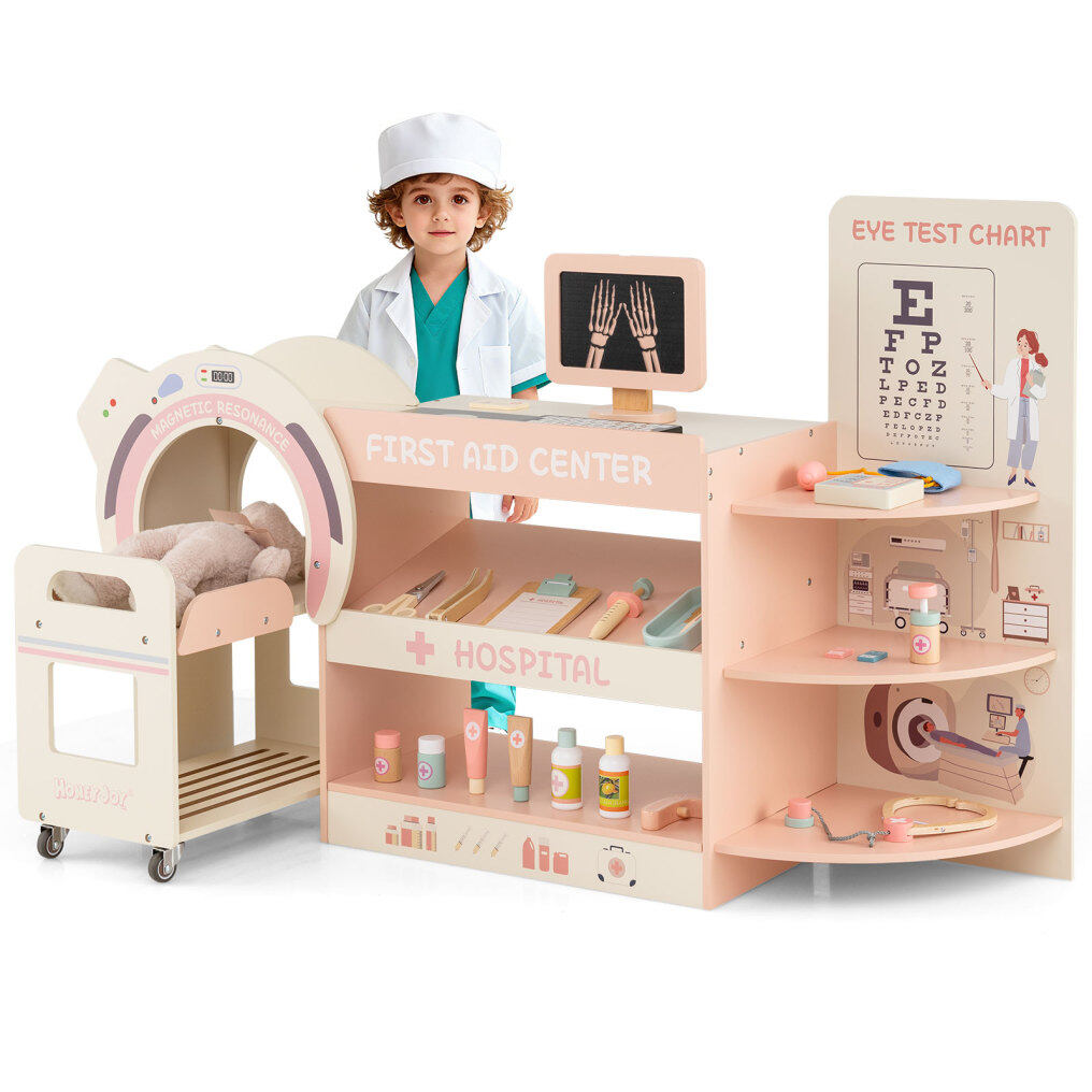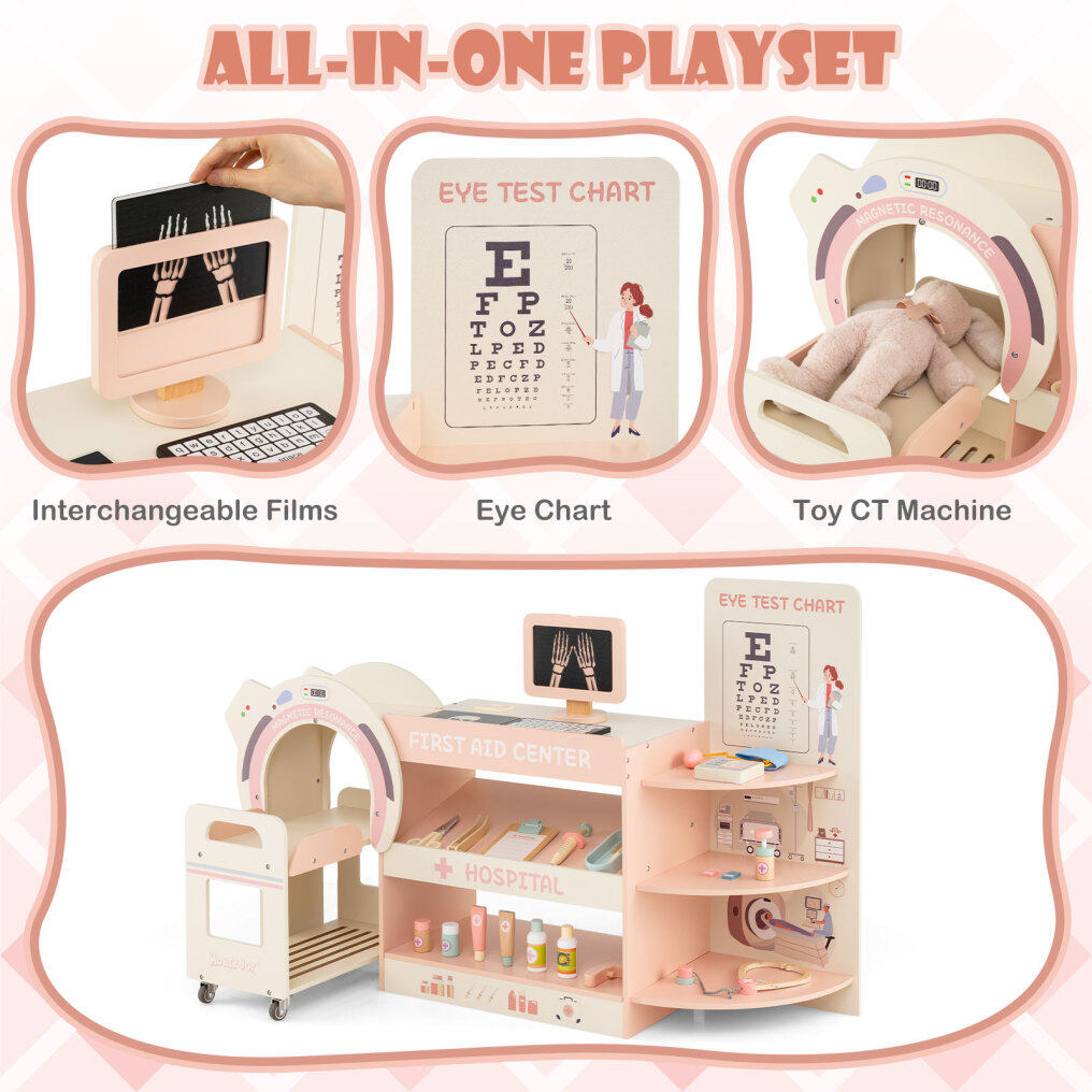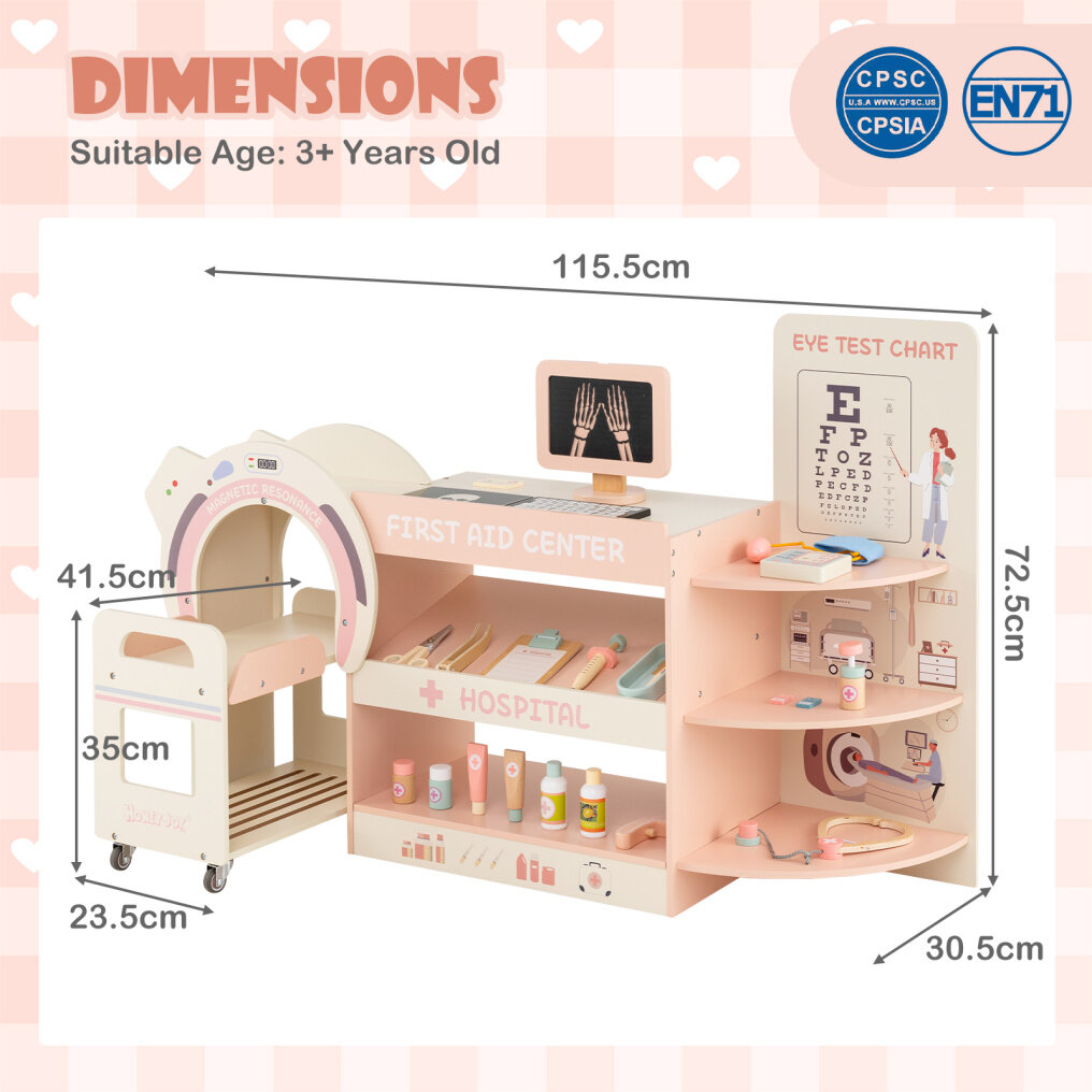 Kids Doctor Play Set Wooden Pretend Hospital Office Kit with Eye Chart Toy CT Machine-Pink