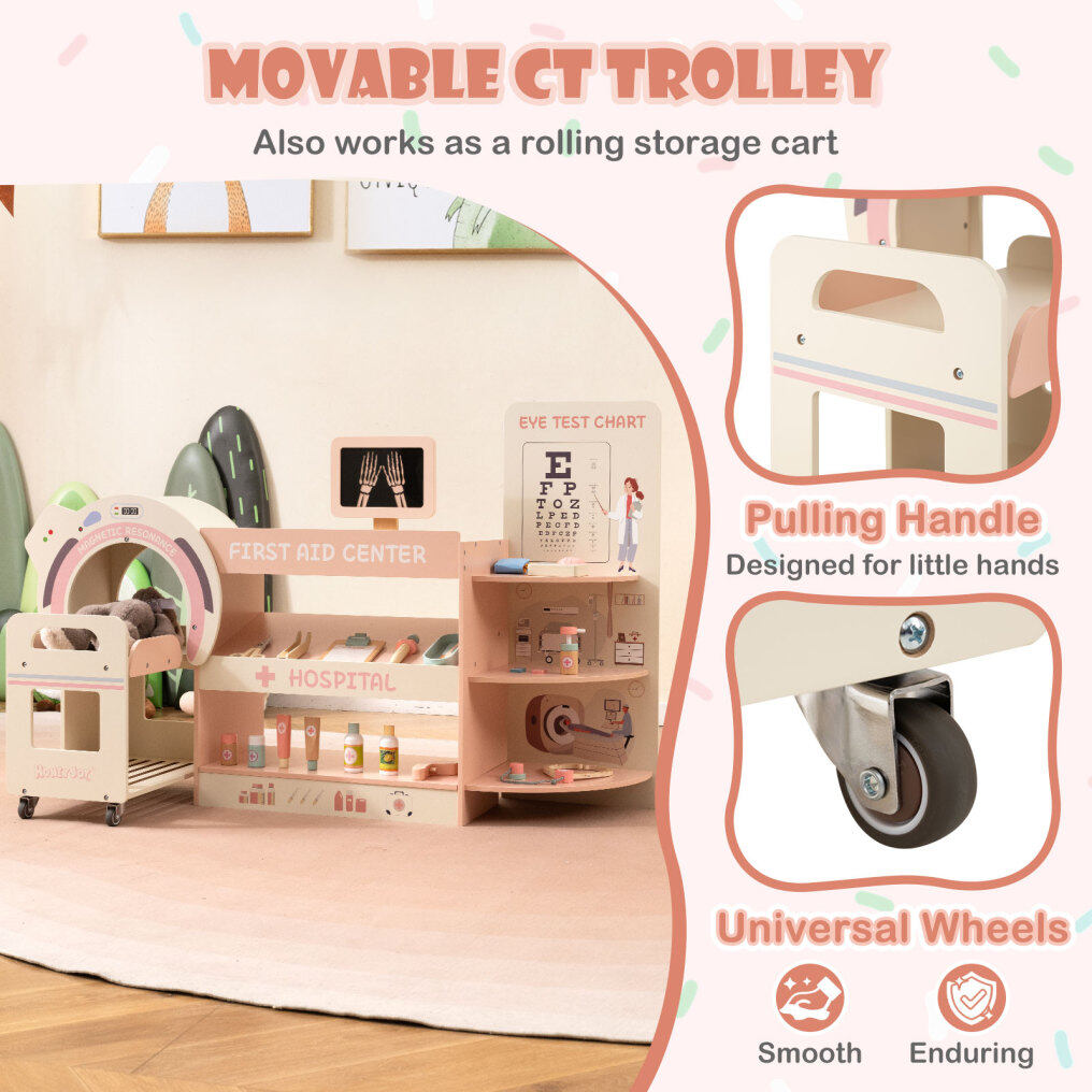 Ample Storage Space: The kids doctor playset comes with multiple storage shelves to keep playtime organized and tidy. Moreover, the included CT trolley doubles as a versatile storage cart with smooth universal wheels, enabling kids to move their hospital essentials from room to room with ease.