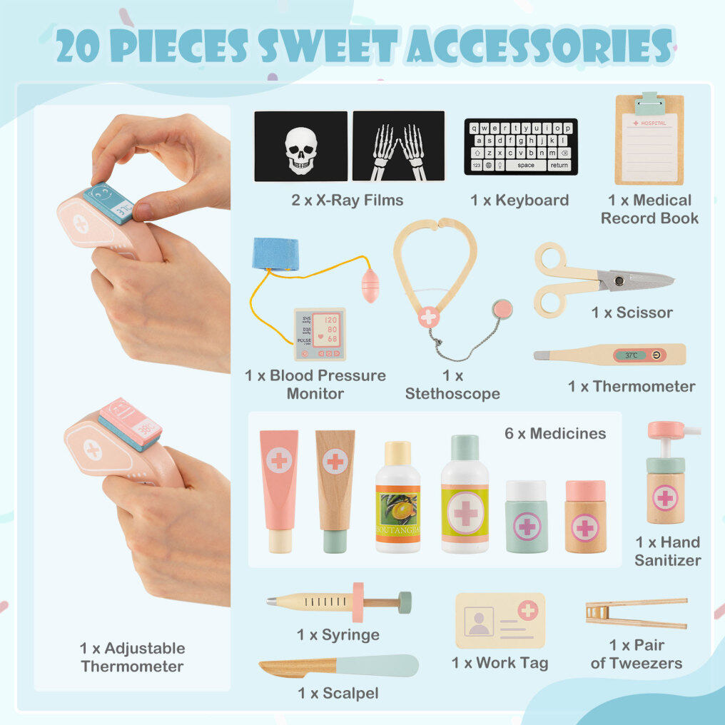 ● Reliable, Child-Safe Construction: Crafted from kid-friendly, enduring grass-tree wood, the toy medical center playset is sturdy enough to withstand enthusiastic little hands while being gentle enough for safe, everyday use. It is built to last so children can enjoy countless hours of imaginative play with friends and family.