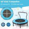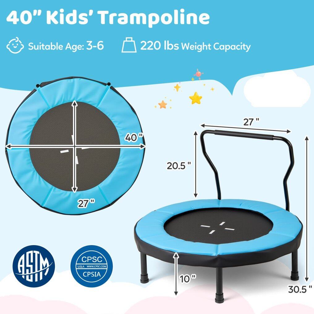 Say bye-bye to couch bouncing! The 40” kids' trampoline transforms endless energy into joyful jumps, keeping little ones active and away from screens. Designed with safety in mind, it features soft padded edges, a grippy foam handle, and a no-gap design to ensure every landing is secure, letting kids hop freely while you enjoy peace of mind. Constructed with a sturdy frame and a waterproof mat, the trampoline effortlessly withstands exuberant play. Watch your little ones giggle in the living room, bounce under the sun in the yard, let them jump high and grow tall with our kids’ trampoline!