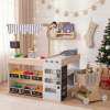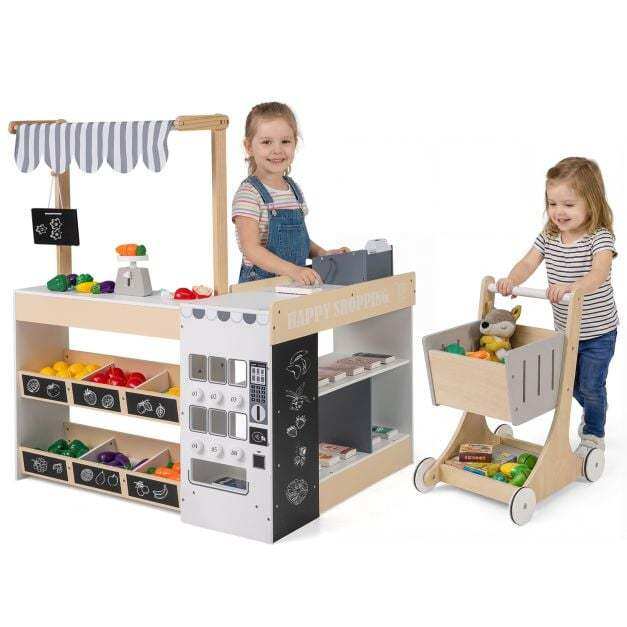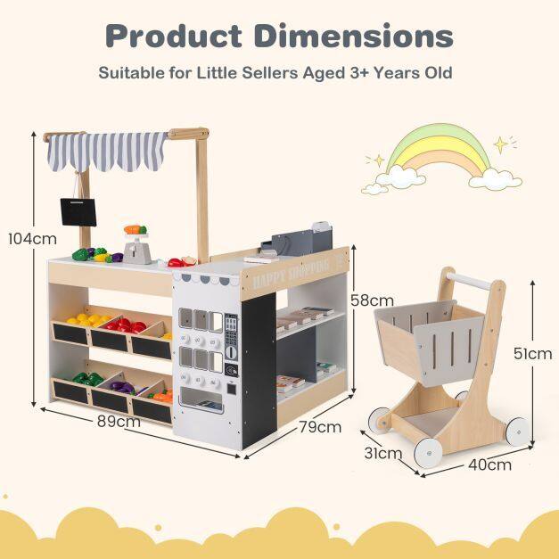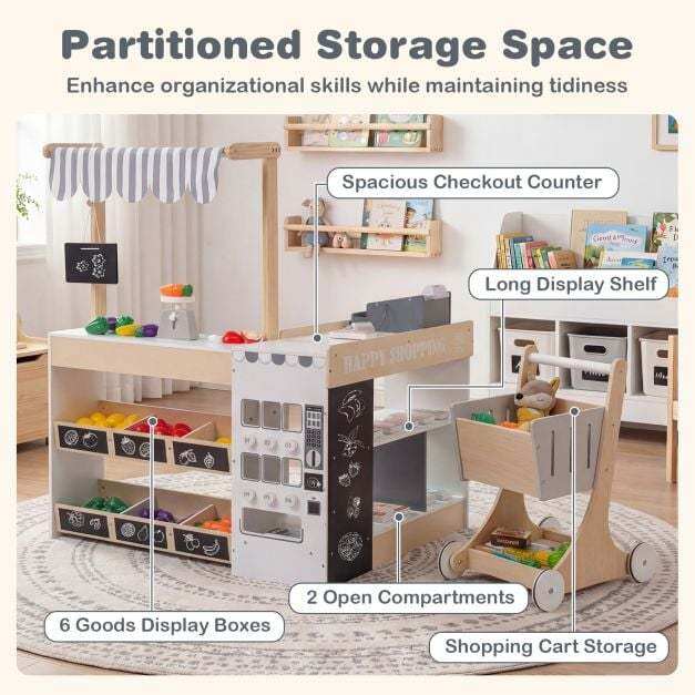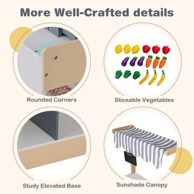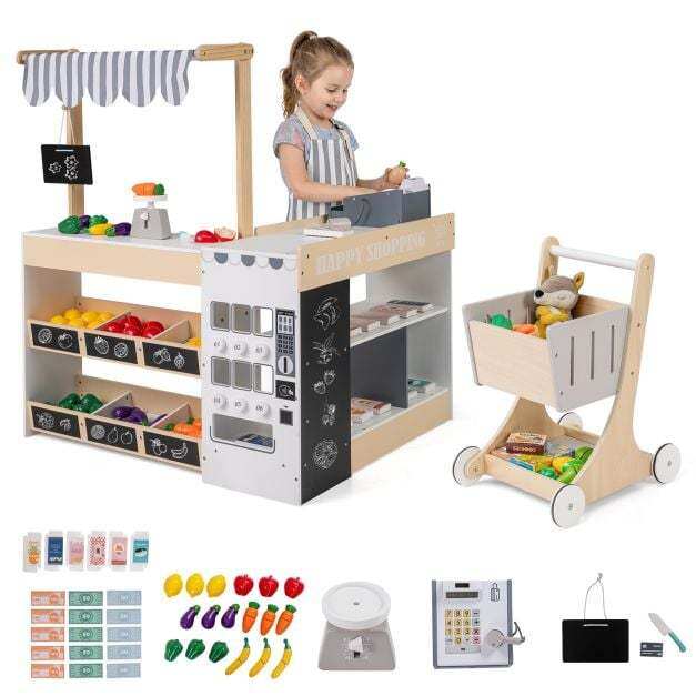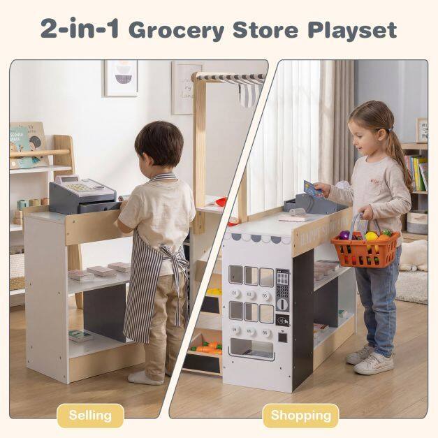 ● Ample Storage & Display: Featuring front display layers and side storage shelves, the market stand toy helps keep accessories neatly organized. Additionally, 2 blackboards offer a creative space for children to write, draw, or display special offers.