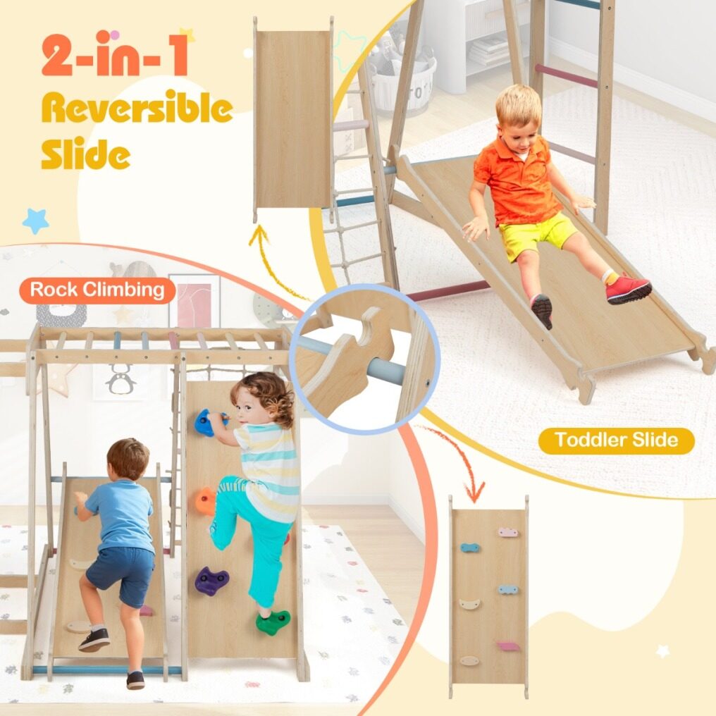 ● 2-in-1 Reversible Slide: The climbing toy's reversible slide lets kids pick between a smooth sliding surface and a rock climbing ramp, both reinforced for safety and equipped with a guardrail. It can be installed facing inward or outward, allowing you to customize its layout to fit your space.
