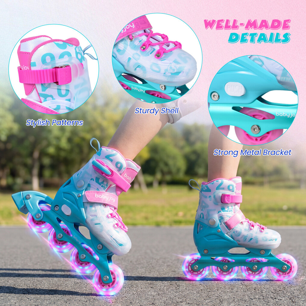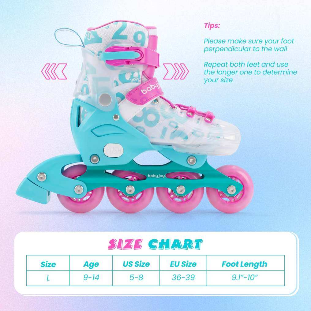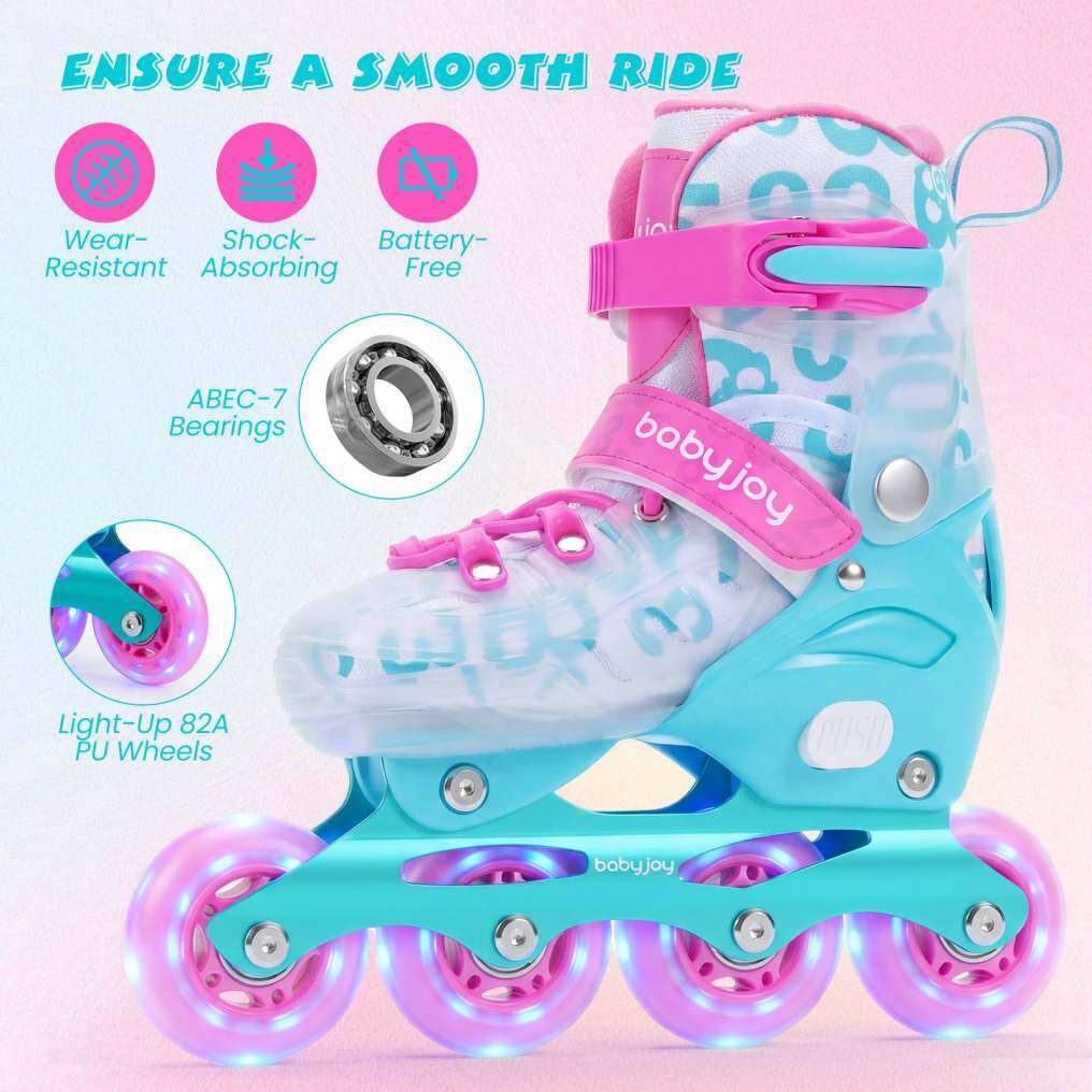 Eye-Catching Lighted Wheels: Featuring motion-activated illuminating wheels, these light-up inline skates automatically glow as kids start skating, creating a bright and fun visual effect with every move. Plus, the battery-free design keeps the excitement going during both practice and routine outings.