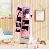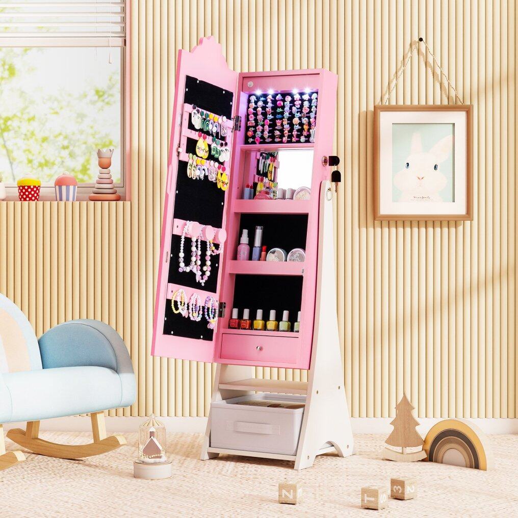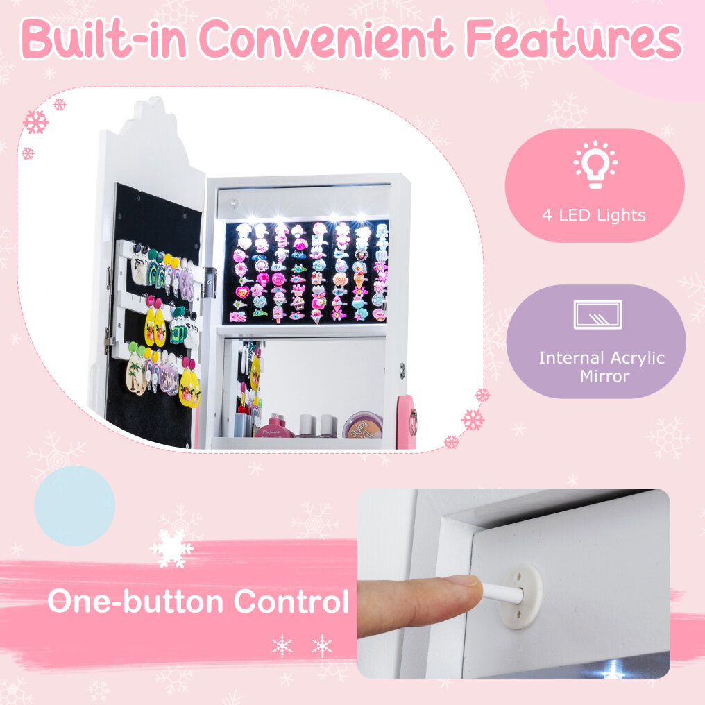 ● Built-in Convenient Features: The internal acrylic mirror and 4 LED lights make it easy for children to find and try on their favorite jewelry even in low light. The lights will automatically turn on when the door is open. You can also use the button for easy control.