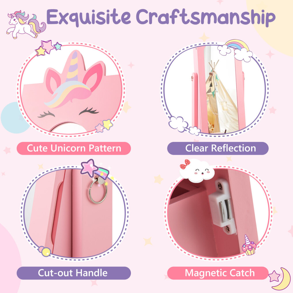 ● A Space-Saving Storage Solution: With 2-in-1 multifunctional design, this kids jewelry cabinet blends a full-body mirror and jewelry storage into a single unit. It's an excellent choice for compact spaces, ensuring that you utilize every square inch of your child's room effectively.