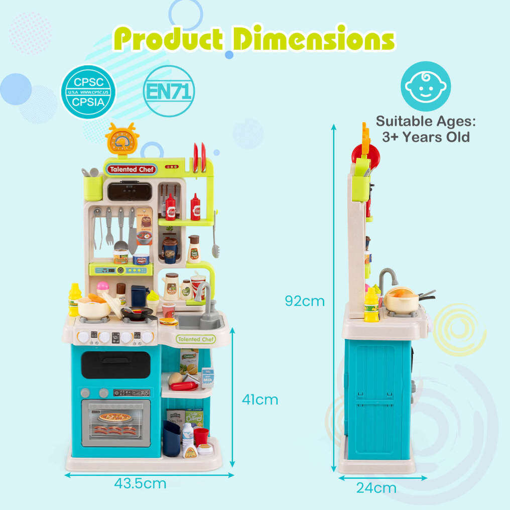 The kids kitchen playset includes a microwave, refrigerator, and oven, complete with a functioning clock and an array of storage options such as dish racks, cutlery holders, and hanging hooks for a tidy setup. Moreover, the magic truly comes alive with two stoves that not only light up but also emit sound and steam, mimicking real cooking experiences. With a water circulation function, little chefs can wash dishes in the sink. To enhance the experience, the chef pretend playset packed with a variety of kitchen accessories that pave the way for endless creative play. Perfect for children above 3 years old, this kitchen play set serves as an exceptional gift that hones creativity, fine motor skills, and social interaction through imaginative play.