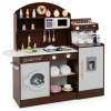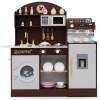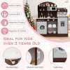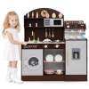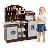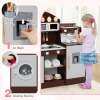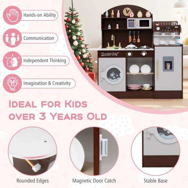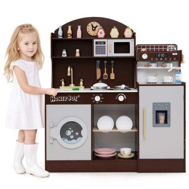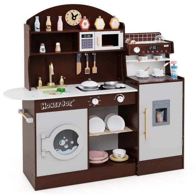 Featuring coffee and ice makers, this wooden kitchen playset is designed to immerse kids in the world of culinary creation. With realistic elements like a clock, microwave, sink, stoves, and washing machine, children can enjoy a comprehensive role-playing experience. The toy kitchen set also includes accessories for pretend play, making it even easier for your child to get creative. When playtime is over, little chefs can easily tidy up by organizing their accessories and belongings in the various storage areas. This toddler kitchen set is a perfect gift for kids aged 3+ years old, helping them develop important life skills while having fun.