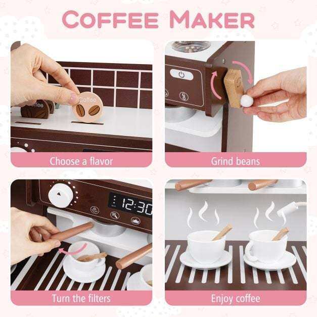Interactive Coffee Machine: The wooden kitchen playset has a detailed coffee maker where kids can choose a flavor, grind beans, and turn the filters. This enhances realism and fosters imagination in children over 3 years old, allowing them to relish the thrill of making their own morning brew!