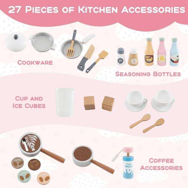 Safe Design with Accessories: Crafted with safety in mind, this toy kitchen playset features rounded edges, a magnetic door catch and stable base. It complies with ASTM and CPSIA and comes with accessories for complete culinary exploration, including cookware, seasoning bottles, coffee accessories, a cup and ice cubes.