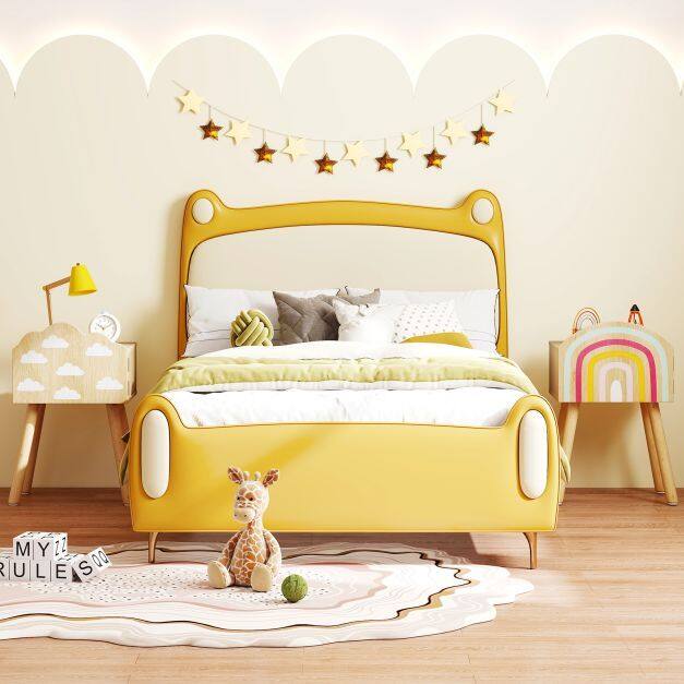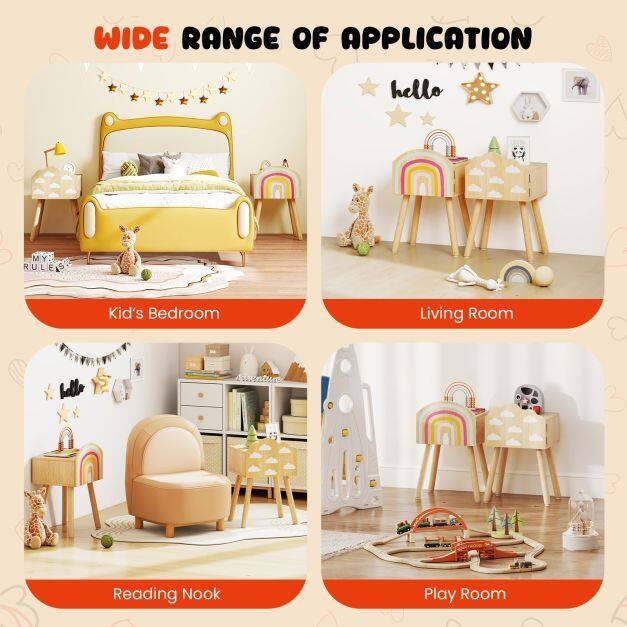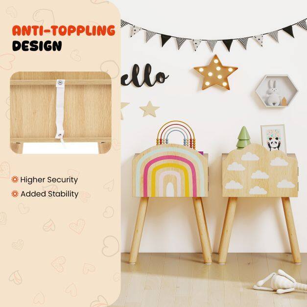 Decorated with delightful rainbow and cloud patterns, the end tables add a splash of color and whimsy to any kid's bedroom, playroom, kindergarten, or nursery. The top area and enclosed cabinet can store kid’s books, toys, blocks, and more. Furthermore, the solid wood legs with anti-slip foot pads keep the nightstand steady and stable. The anti-toppling design ensures enhanced stability and avoids tipping over for higher security.