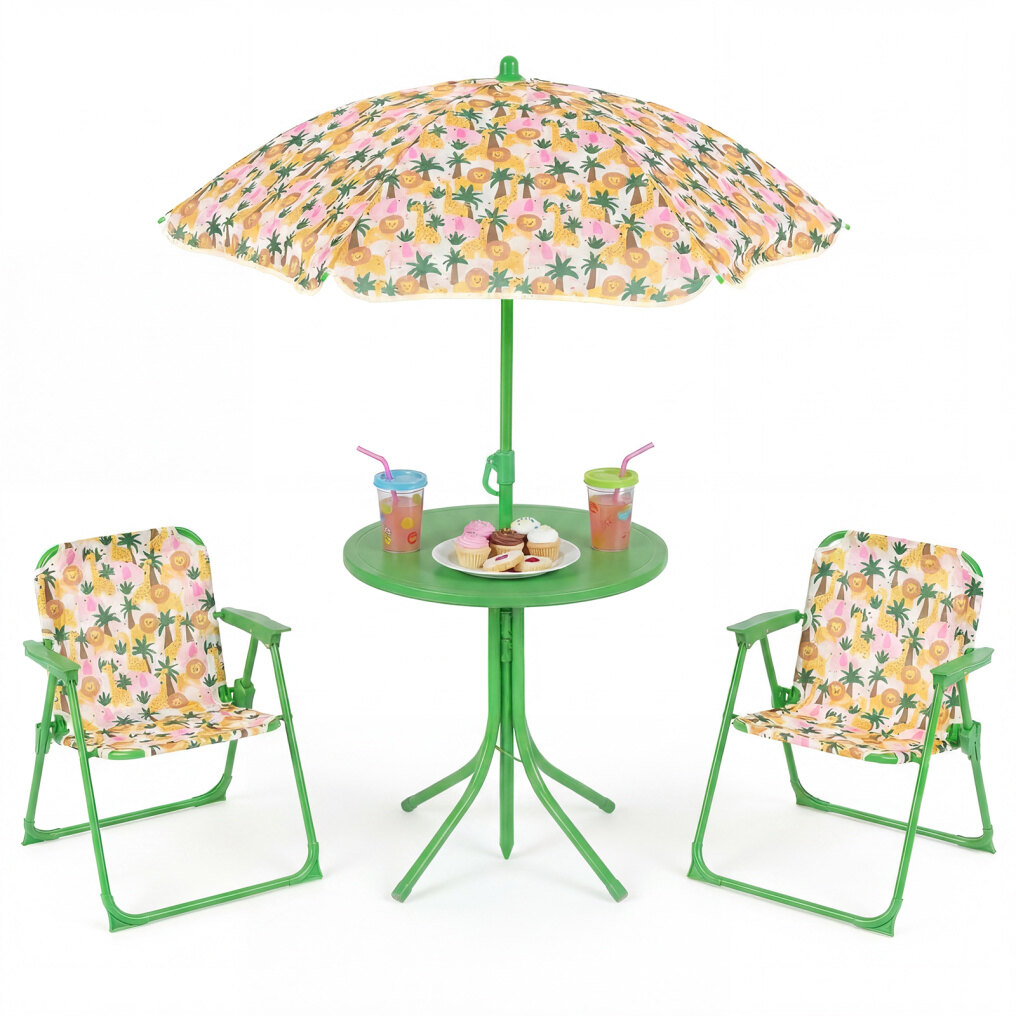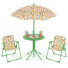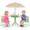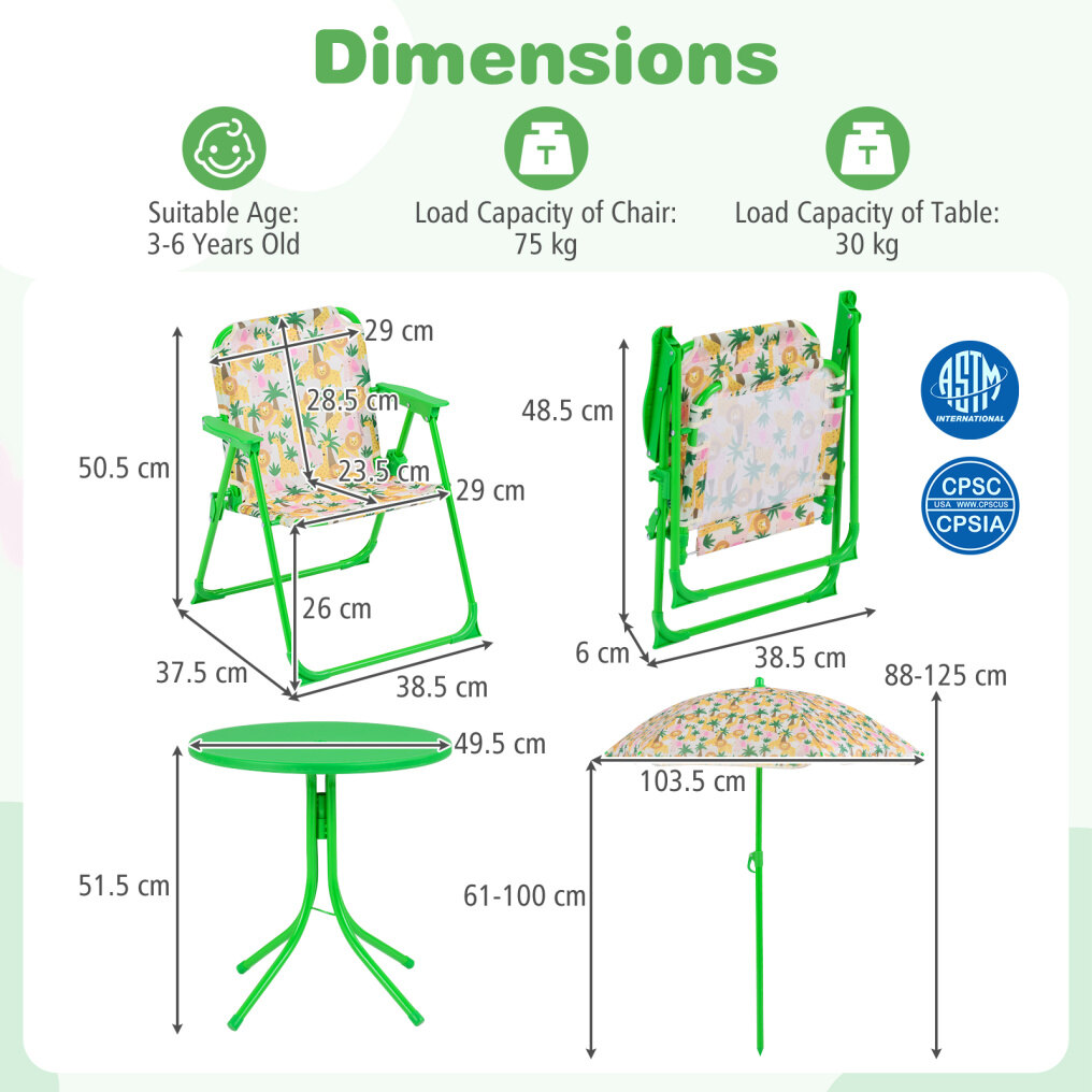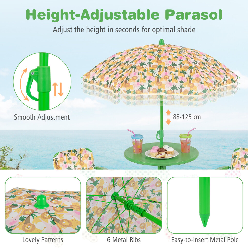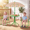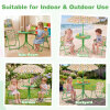 ● Adjustable Umbrella: The height-adjustable umbrella of the kids table and chair set helps you set shade where kids need it most. Its enduring canopy with lovely patterns stands up to daily use, while 6 metal ribs keep it steady, and the metal pole with sharp bottom ensures a secure, stable anchor when inserted into the ground.