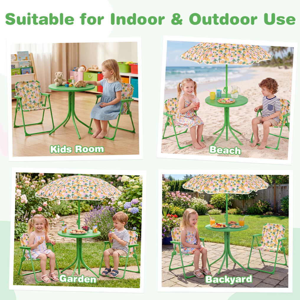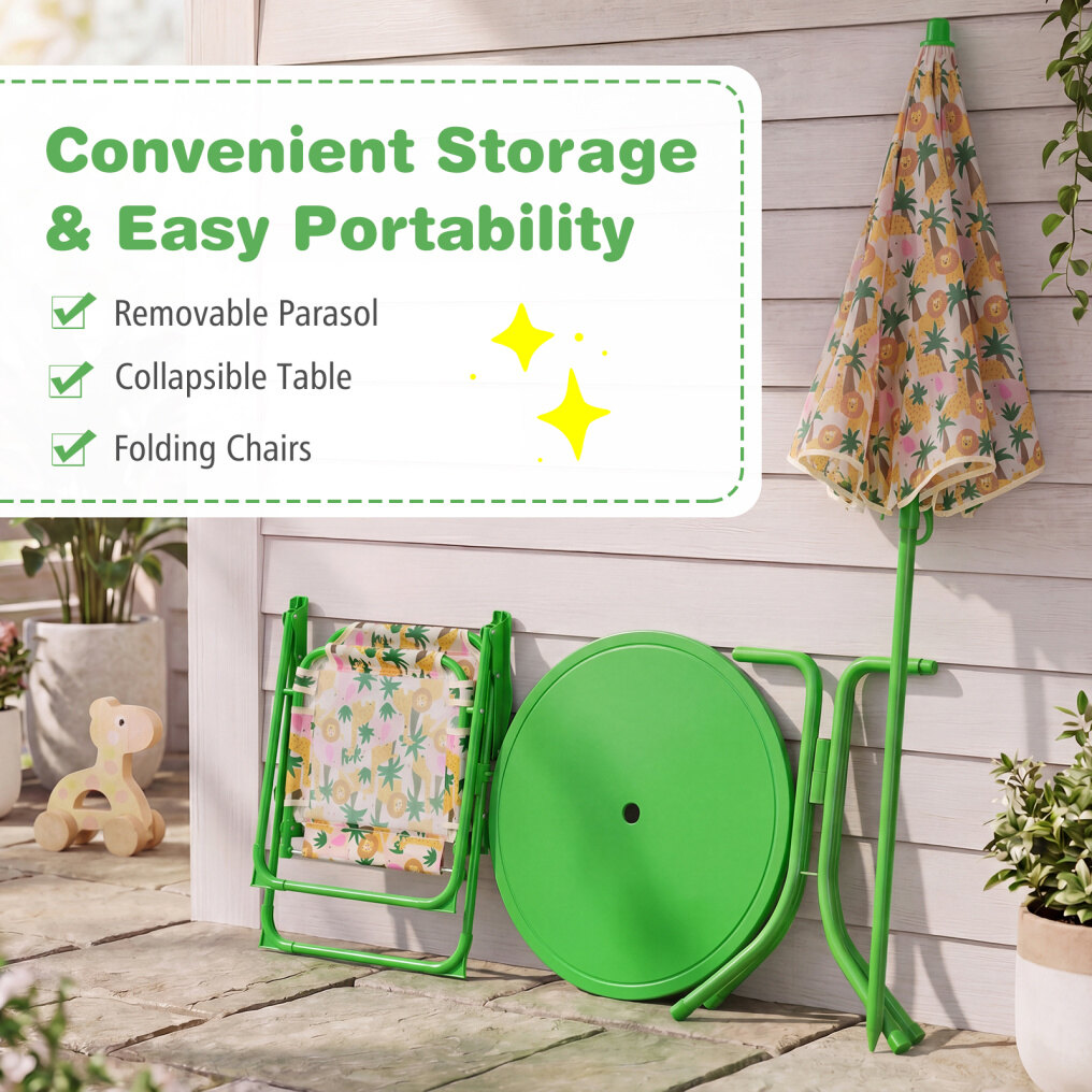 ● Packs Up Fast, Stores Small: When playtime moves, this kids picnic table set moves with you thanks to a removable parasol, 2 folding chairs, and a collapsible table. It's easy to bring to the yard, porch, camping, or a playroom corner, then tuck away when done.
