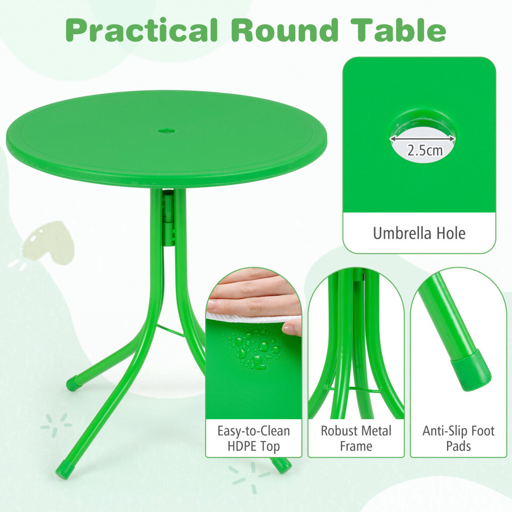 ● Safe, Gift-Ready Build Quality: Built for real kid energy, this kids patio furniture uses strong metal frames, secure bayonet locks, anti-slip foot pads, and an enduring HDPE tabletop that's easy to wipe clean. ASTM and CPSIA compliant, it makes a perfect gift for ages 3-6 that encourages social play and confident independence.