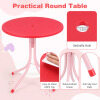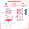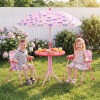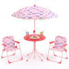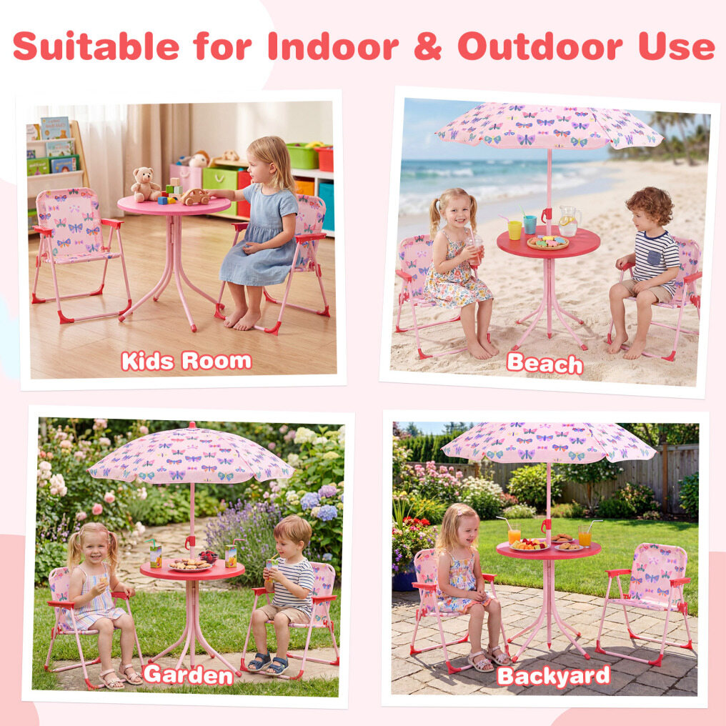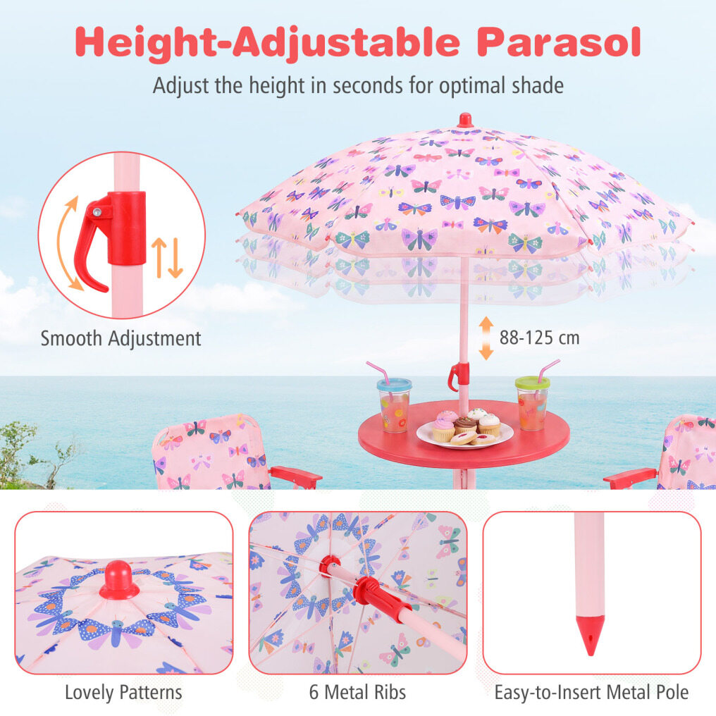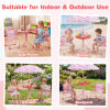 ● Adjustable Umbrella: The height-adjustable umbrella of the kids table and chair set helps you set shade where kids need it most. Its enduring canopy with lovely patterns stands up to daily use, while 6 metal ribs keep it steady, and the metal pole with sharp bottom ensures a secure, stable anchor when inserted into the ground.