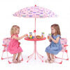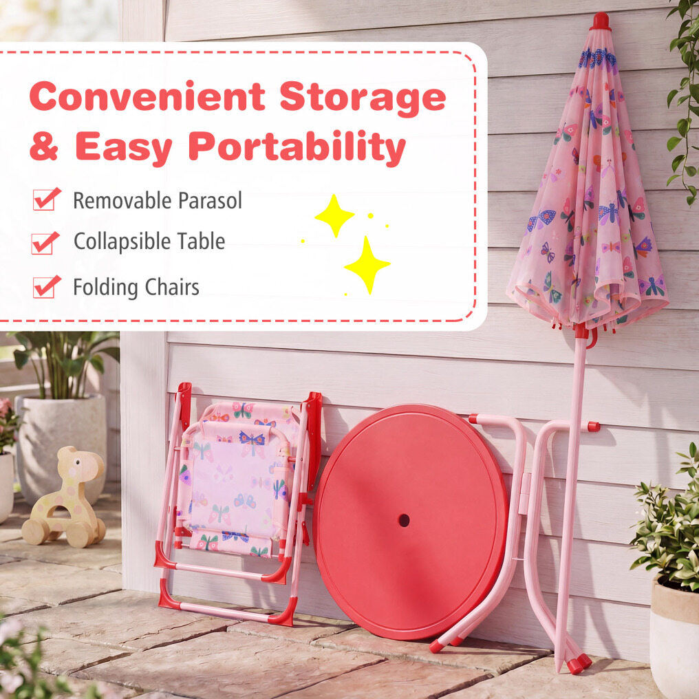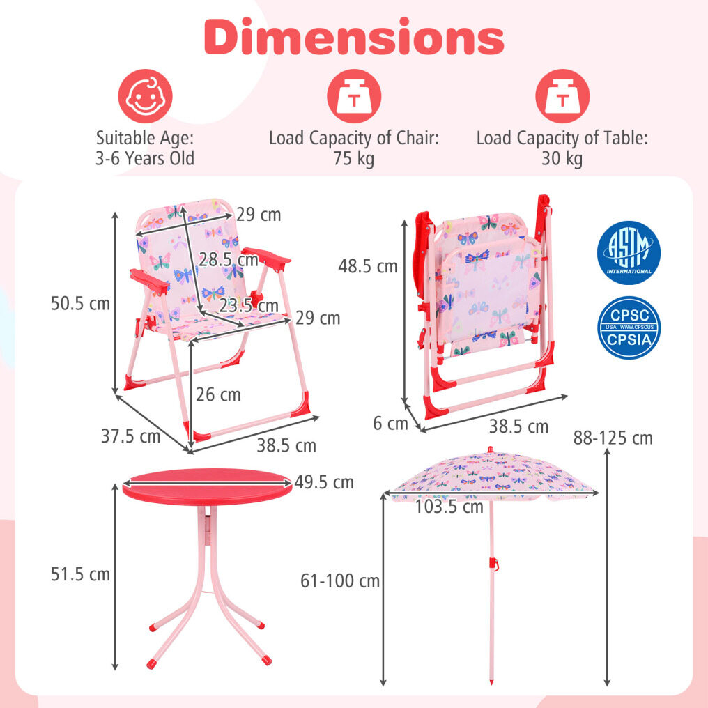 ● Packs Up Fast, Stores Small: When playtime moves, this kids picnic table set moves with you thanks to a removable parasol, 2 folding chairs, and a collapsible table. It's easy to bring to the yard, porch, camping, or a playroom corner, then tuck away when done.