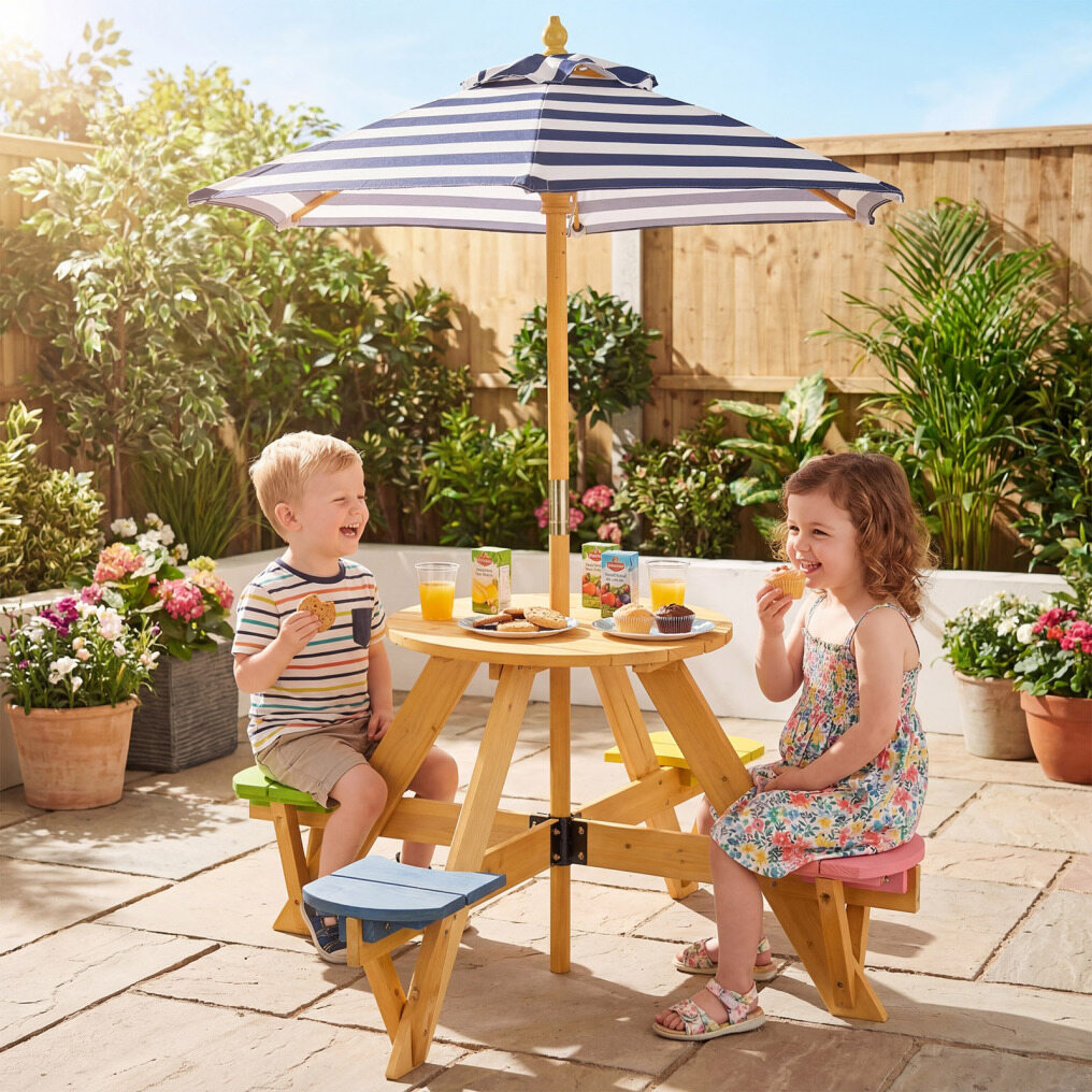 ● Solid Wood Construction: Crafted from high-strength fir wood, this kids outdoor furniture set is built to handle long-time use. The splinter-free surface ensures safe use for little hands, making it a reliable and practical addition to the growth of your kids.