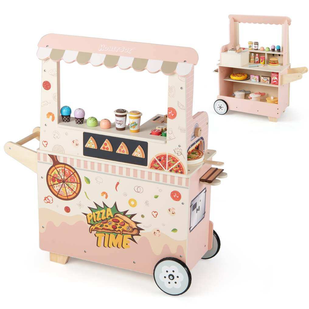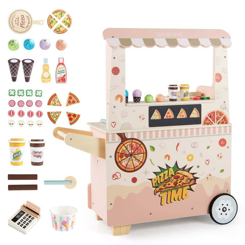 ● Kid-Friendly Construction: Crafted from robust wooden structure with smooth rounded corner, this pizza cart with splinter-free surface is built for safety and comfort. It also features a cozy-to-grip push handle and 2 noise-free and non-slip wheels to let kids push and move their fun food truck anywhere with ease.