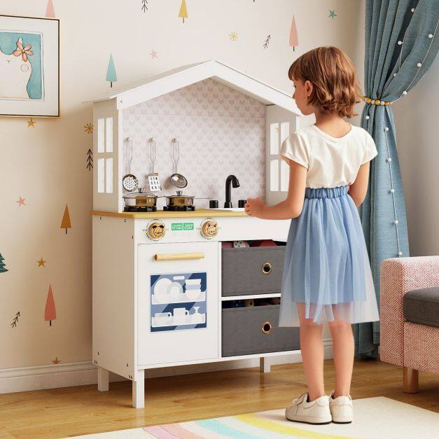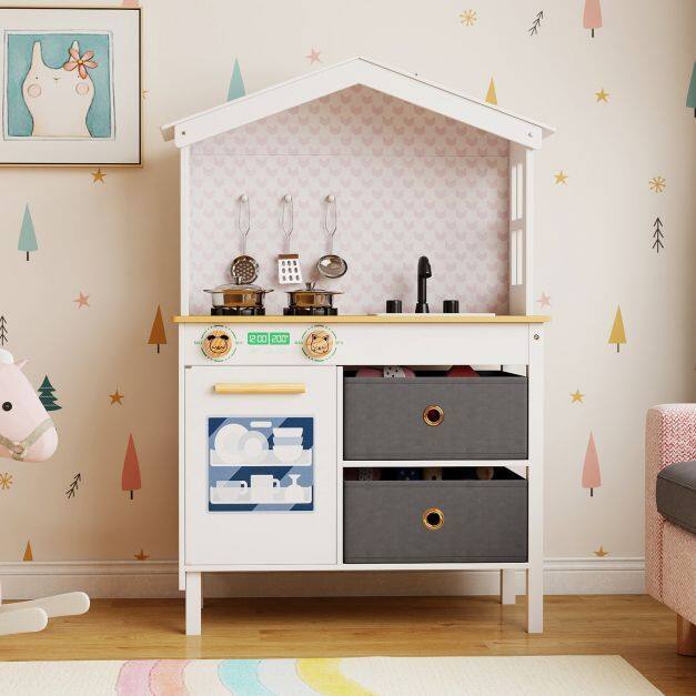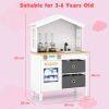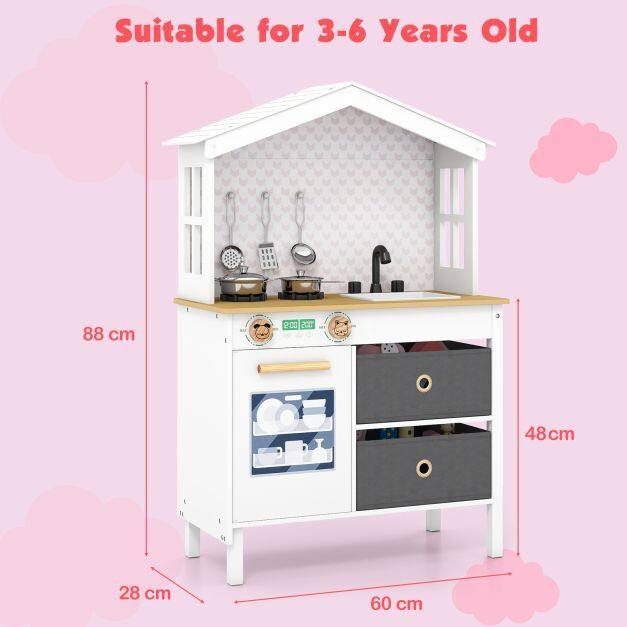 ● Adorable House Shape Inspires Creativity: The kids play kitchen's charming house design and lovely backdrop instantly spark endless imaginative adventures. Ideal for fostering creativity, sensory exploration, and social interaction, it invites children to cook, clean, and invent stories with friends and siblings.