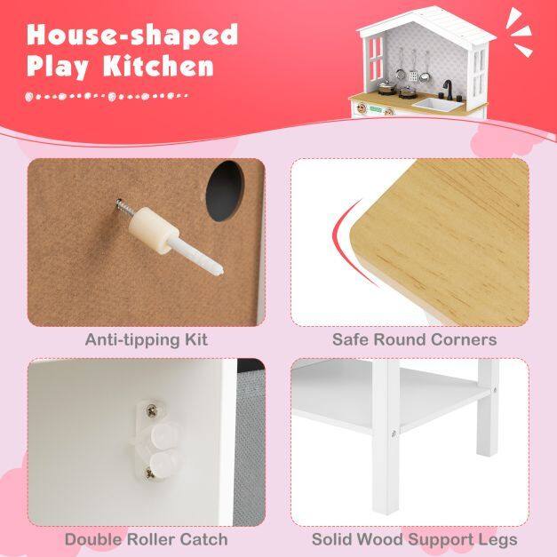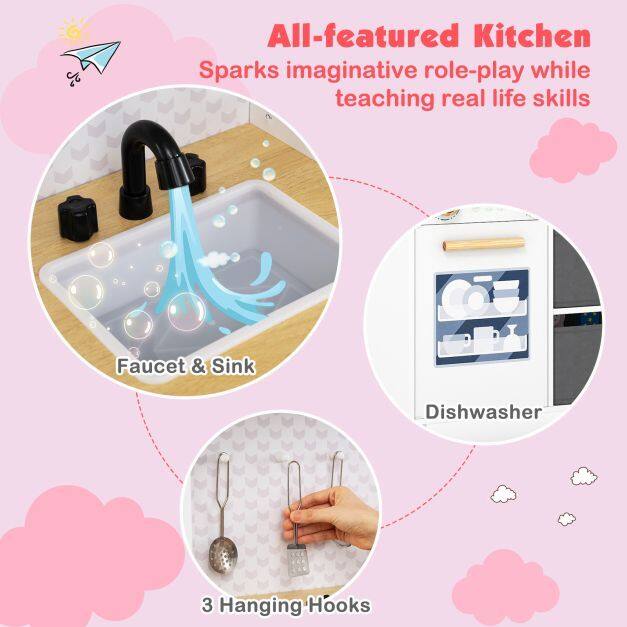 ● Safe, Reliable Construction: Built with young children's safety in mind, the wooden play kitchen showcases rounded corners to prevent bumps, sturdy pine wood handle and legs for lasting strength, and an included anti-tipping kit for extra stability. Parents can relax while kids focus on imaginative play.