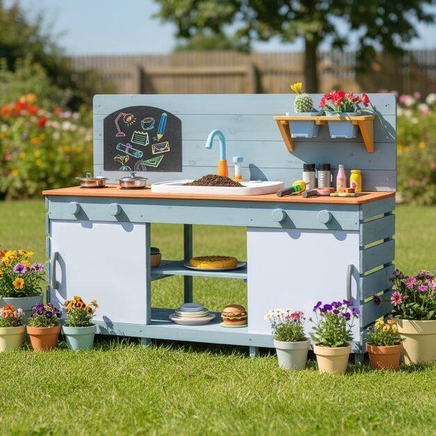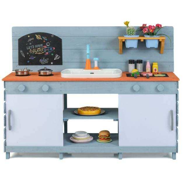 ● Sturdy Wooden Construction: Crafted from sturdy fir wood and stable support legs, this outdoor mud kitchen maintains a solid foundation to prevent tipping during play. Additionally, the rounded edges and splinter-free surface ensure a safe play space.