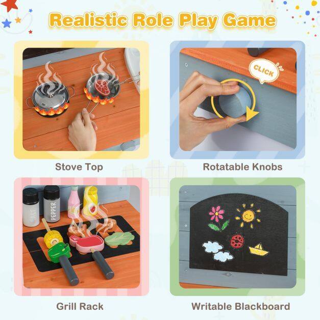● Imaginative Culinary Exploration: Featuring dual stoves and a grill rack, the play kitchen encourages children to explore their creativity and culinary skills. The rotating knobs make a clicking sound to enhance play experience while the chalkboard offers young chefs a space to jot down daily specials or display their menu.