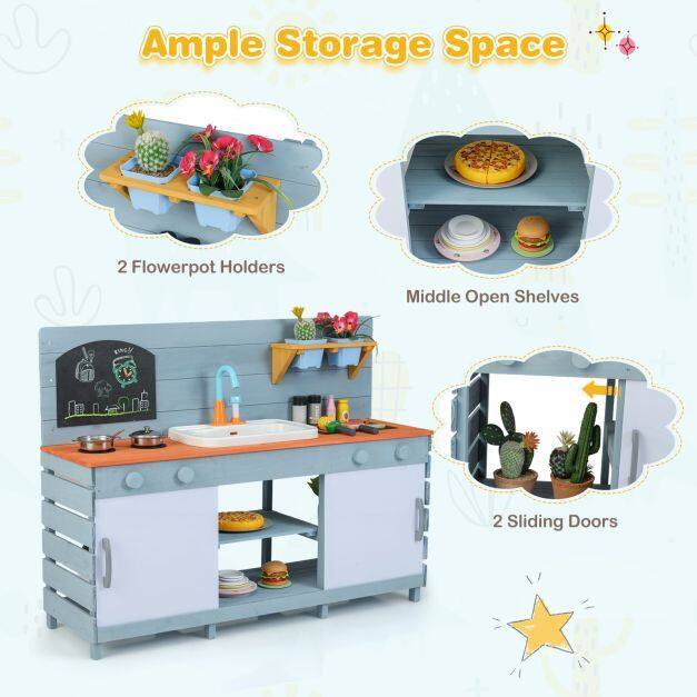 ● Organization Made Easy: This play kitchen offers practical storage solutions with 2 open shelves and cabinets, providing plenty of space for accessories. Flowerpots are included as well, giving kids the opportunity to learn about plants and nature as they play.