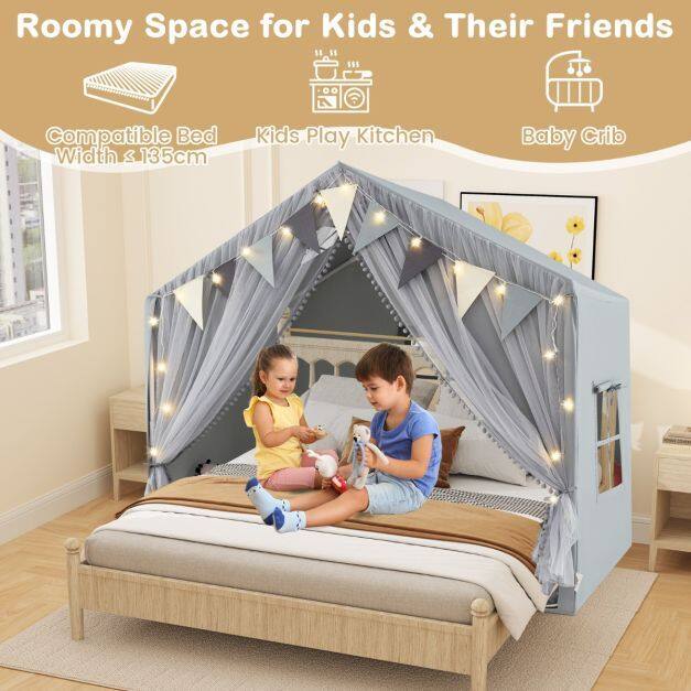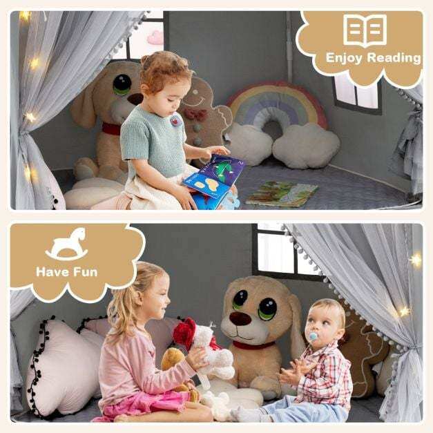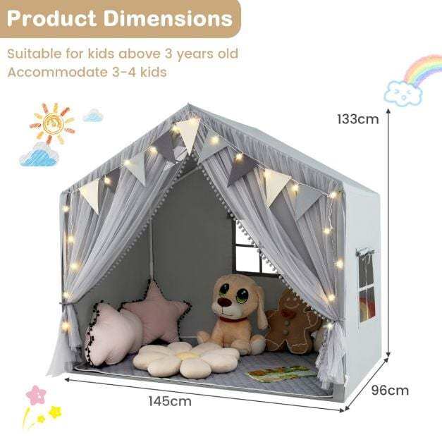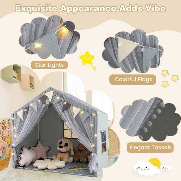 Are you looking for a versatile and engaging play tent for your little ones? Look no further! Our kid-friendly play tent features a double curtain design that offers the perfect balance between concealment and breathability. With a large playing space accommodating 3-4 kids and a kids' bed up to 135 cm wide, this tent creates a cozy and private room for endless fun. Meanwhile, this enjoyable kid play house comes with star lights and colorful pennant banners, offering endless fun to your kids. The comfortable padded mat is soft and breathable for safe play, you can easy to clean it with a washing machine. This play house can be an ideal choice for children aged 3+.