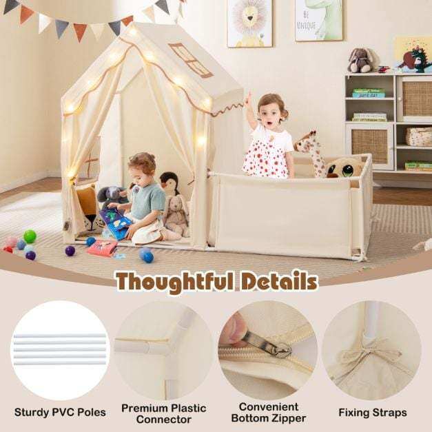 ● Hassle-free Assembly: Designed for easy installation, the children tent with playpen can be set up without the need for any tools. Its sturdy frame uses plastic connectors and a zippered base, streamlining the assembly process for parents.