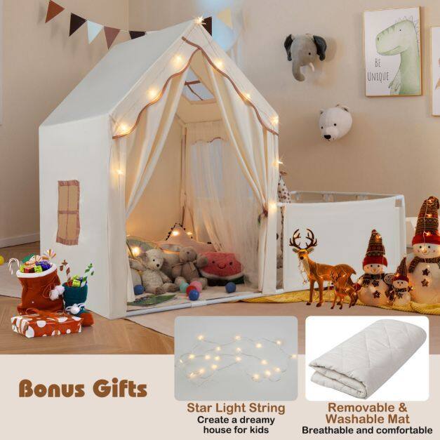 ● Star Lights & Padded Mat: Adorned with a sparkling star string light, the toddle playhouse tent steeps your child's playtime in whimsy and delight. A cotton-padded mat ensures a soft and cozy spot to sit or lie down. Plus, the mat's washable design simplifies cleaning and upkeep.