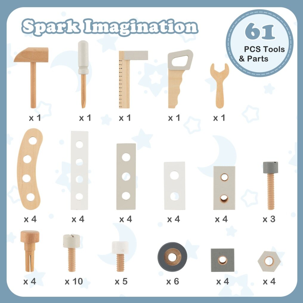 ● 61 PCS Tools and Parts Set: This wooden tool workbench for kids comes with hammer, wrench, screwdriver, screws, nuts, table saw, blackboard, ruler and more parts to spark imagination for creative building, which will keep kids busy for hours.