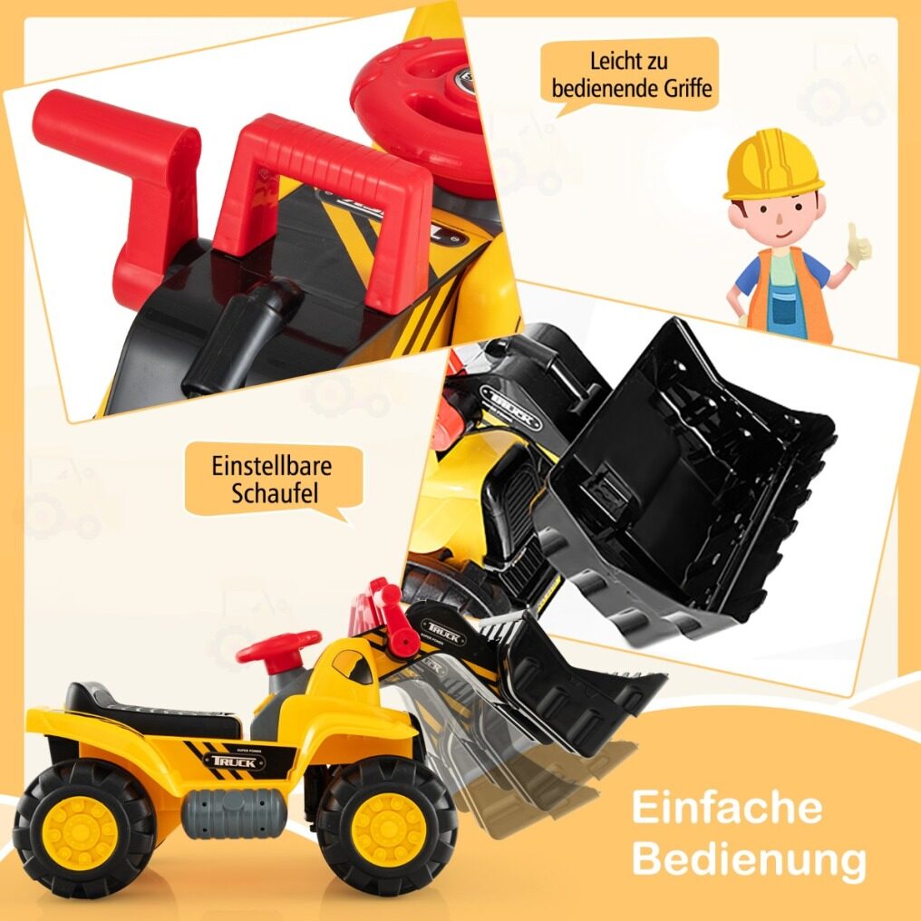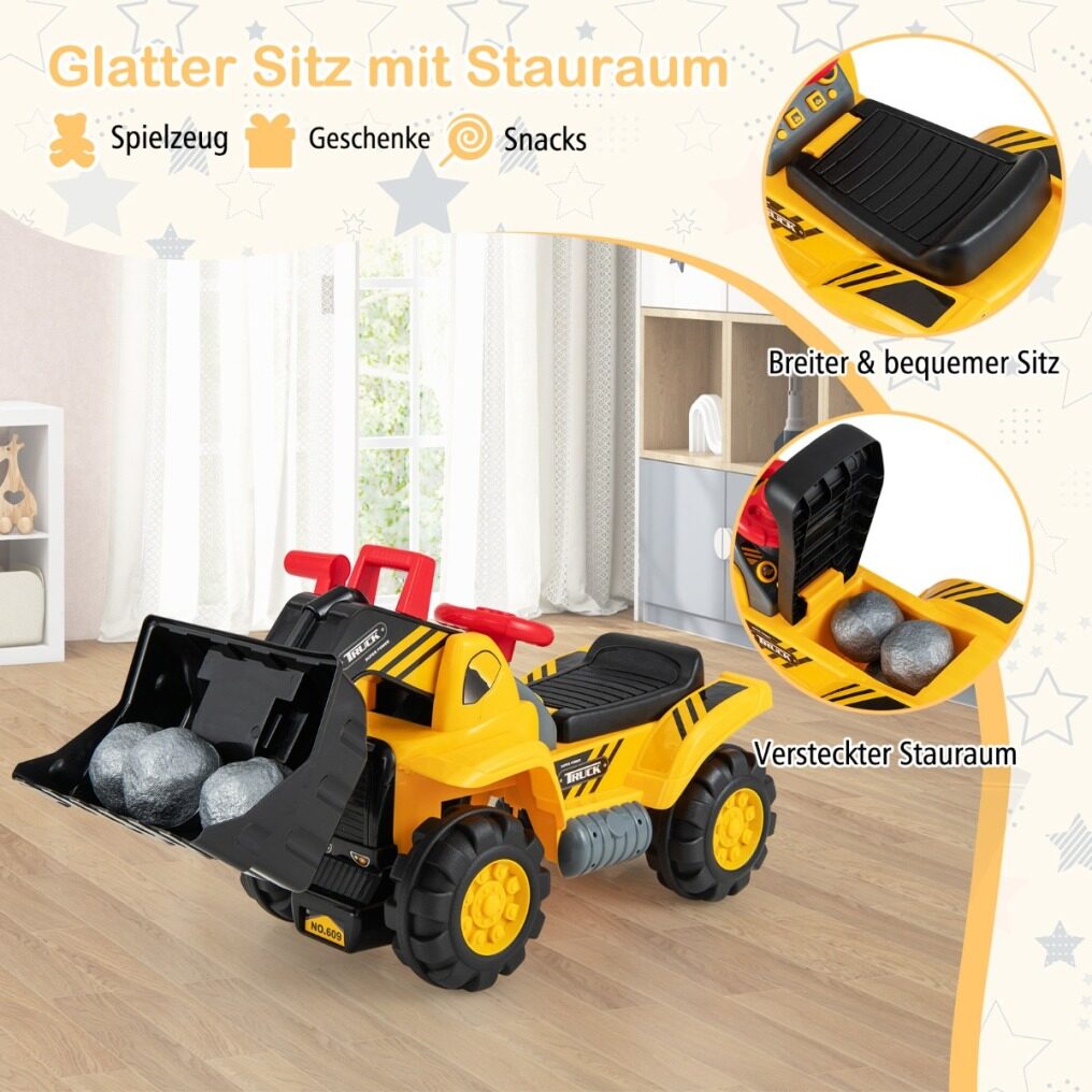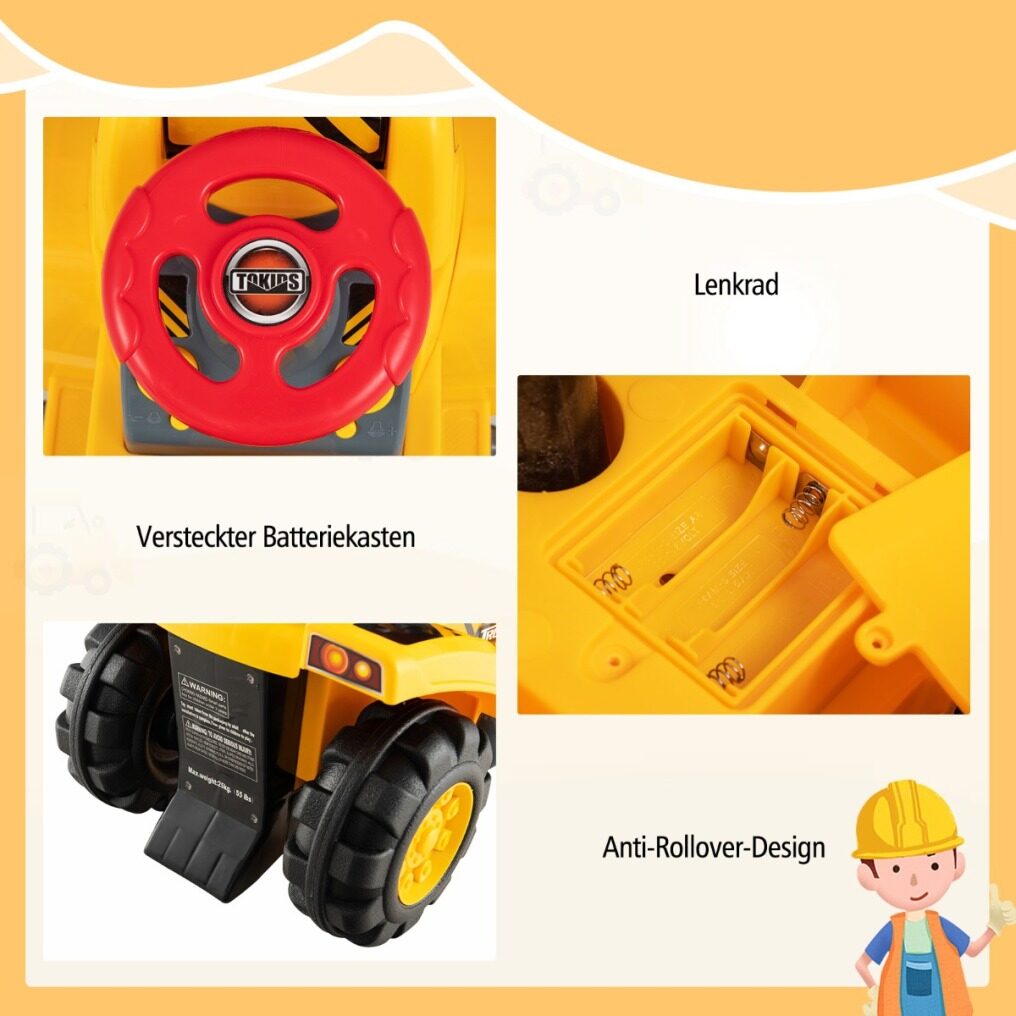 Kids can move forward or backward with their feet and operate the bucket with control handles to simulate digging or dumping. Besides, we designed it with a horn sound, dump truck sound or starting sound for a realistic experience. It also includes 1 helmet and 3 toy stones for kids to play. Plus, toddlers are allowed to open the seat to store different toys or snacks for extra joy. And 4 HDPE wheels allow for smooth and steady movement on flat roads, allowing kids to enjoy the riding fun. If you are looking for such a product, do not hesitate to buy it!