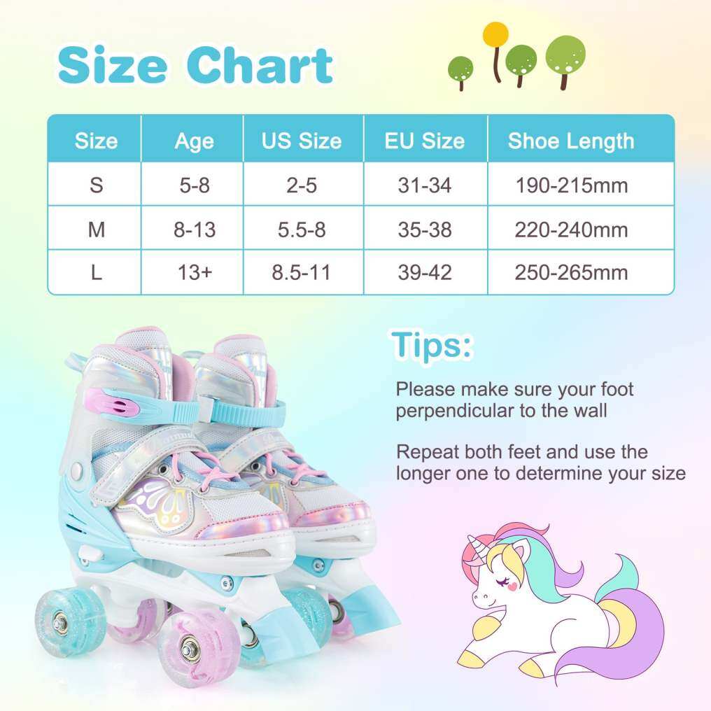 • 4 Sizes for Growing Feet: Featuring a simple one-button adjustment system, these roller skates for kids ages 8-13 years old seamlessly expand across 4 sizes, effortlessly accommodating your child’s foot as they grow. From child to teens, these skates ensure a secure fit so every stage is packed with hours of skating fun.