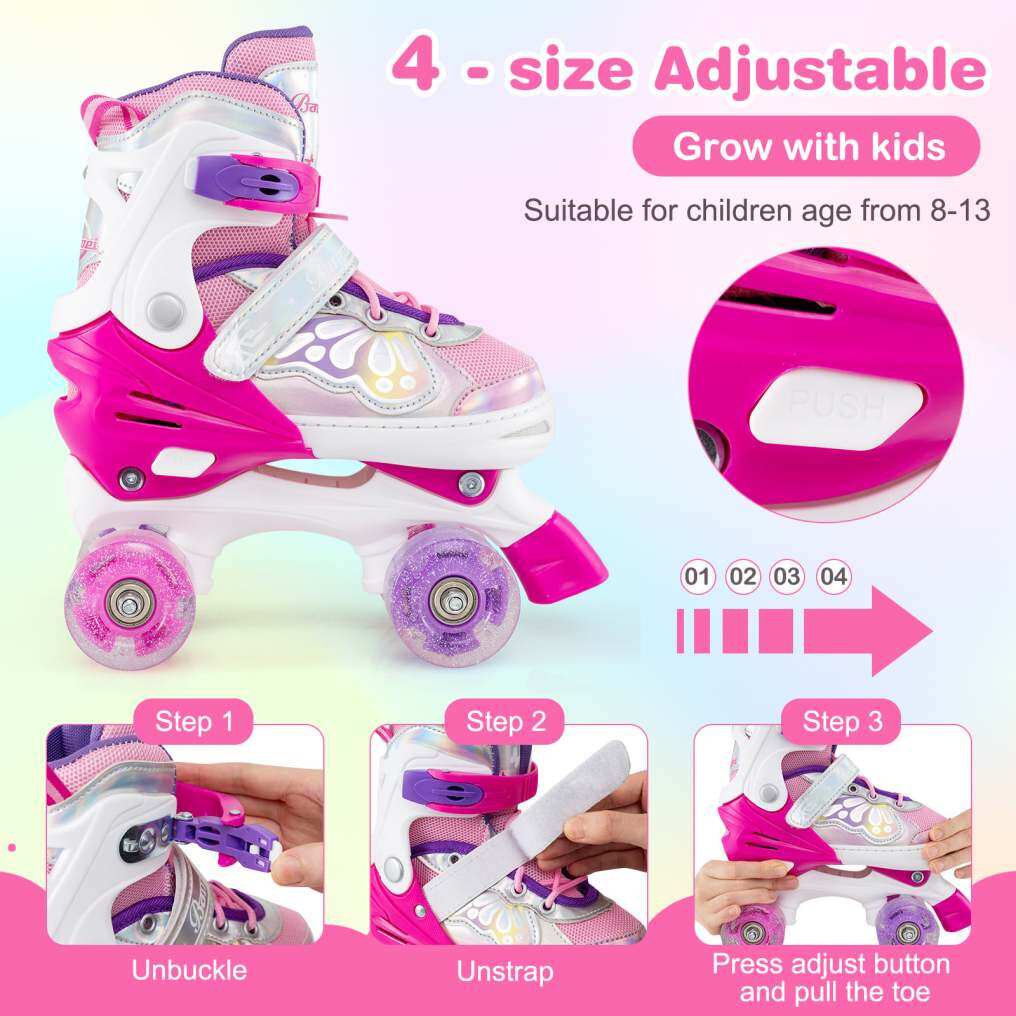 • 4 Sizes for Growing Feet: Featuring a simple one-button adjustment system, these roller skates for kids ages 8-13 years old seamlessly expand across 4 sizes, effortlessly accommodating your child’s foot as they grow. From child to teens, these skates ensure a secure fit so every stage is packed with hours of skating fun.