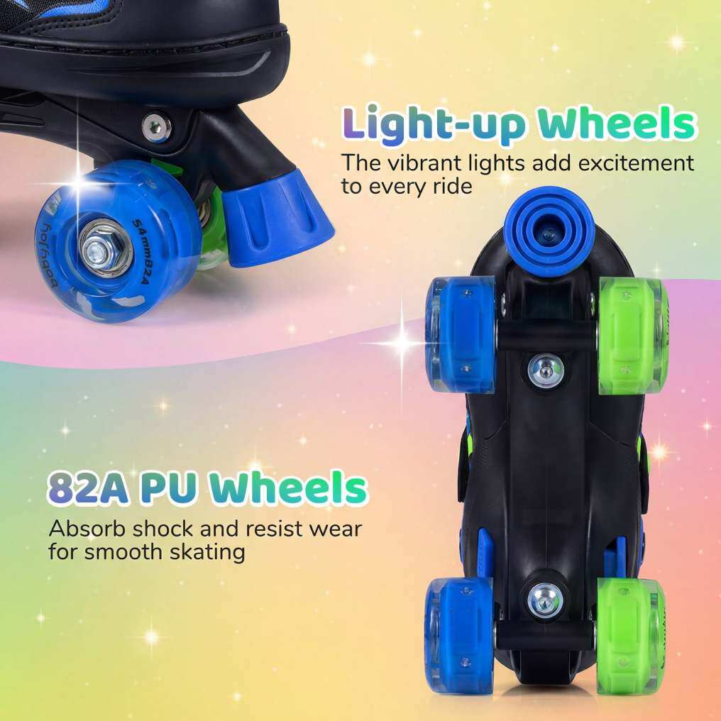 ● Battery-Free Light-Up Wheels: Equipped with motion-activated glowing wheels, these light-up roller skates illuminate with no batteries required. In addition, the vibrant lights add excitement to every ride, whether on neighborhood sidewalks or at the rink, making each outing more enjoyable.