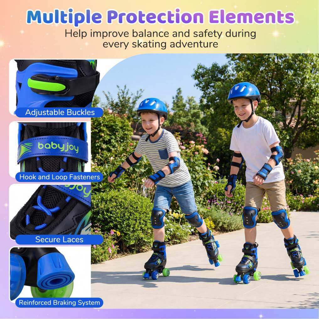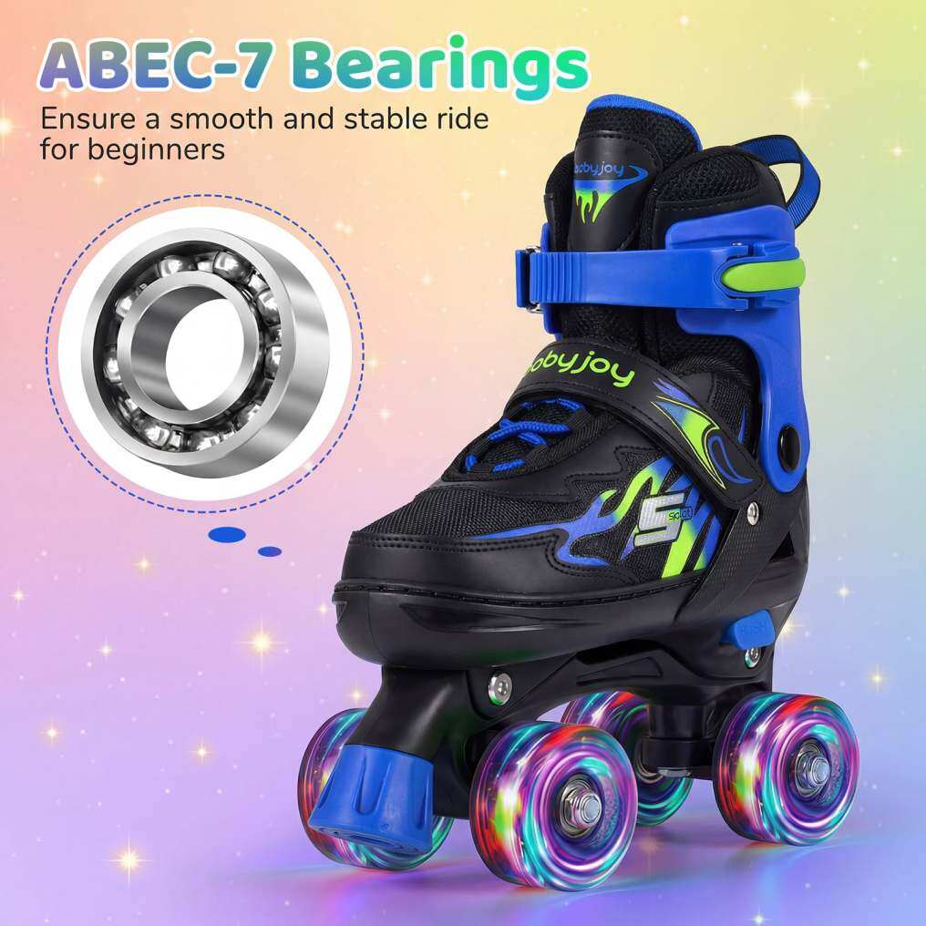 ● Adjustable Sizing for Growing Kids: Engineered to grow with your child, these skates feature a convenient one-button adjustment system. With a simple press, they smoothly expand across 4 sizes, ensuring a consistently secure and comfortable fit for kids ages 7-9.