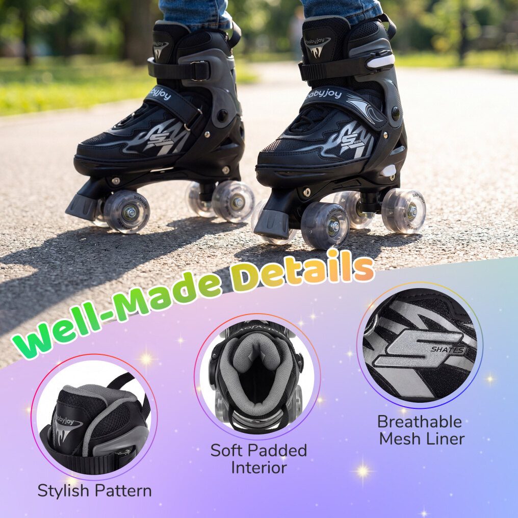 ● Comfortable Skating Experience: Built for comfort and control, these quad roller skates feature breathable mesh fabric and a soft padded lining to keep feet comfortable during long sessions. Plus, high-quality 82A PU wheels paired with ABEC-7 bearings ensure a smooth and stable ride for beginners.