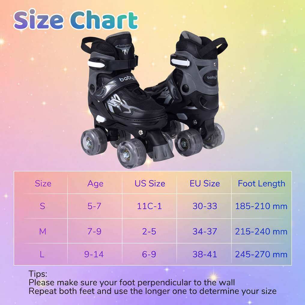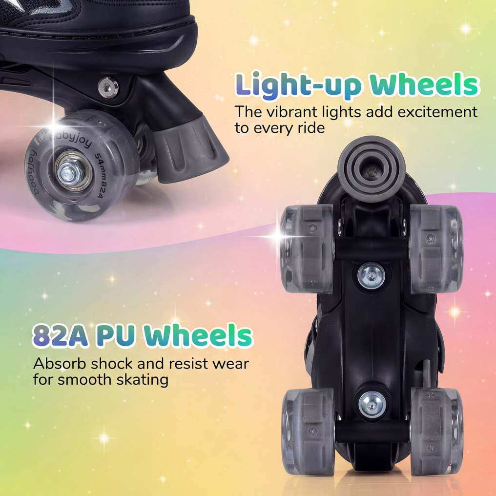 ● Battery-Free Light-Up Wheels: Equipped with motion-activated glowing wheels, these light-up roller skates illuminate with no batteries required. In addition, the vibrant lights add excitement to every ride, whether on neighborhood sidewalks or at the rink, making each outing more enjoyable.