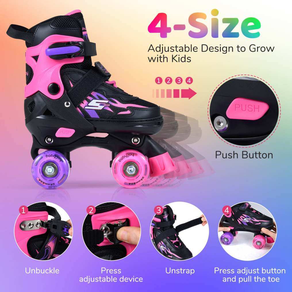 ● Adjustable Sizing for Growing Kids: Engineered to grow with your child, these skates feature a convenient one-button adjustment system. With a simple press, they smoothly expand across 4 sizes, ensuring a consistently secure and comfortable fit for kids ages 5-7.