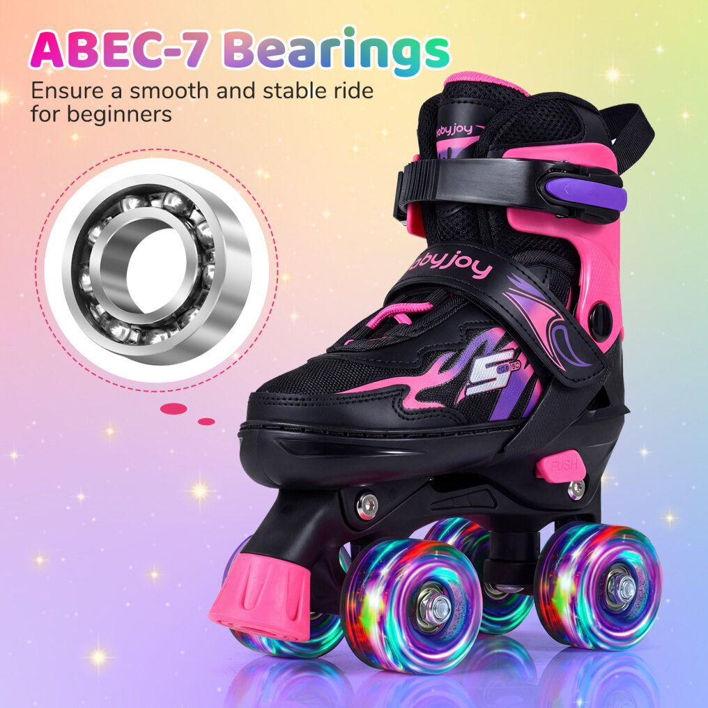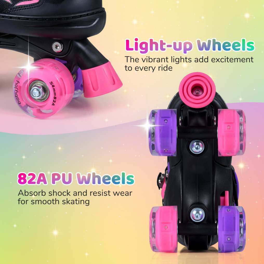 ● Battery-Free Light-Up Wheels: Equipped with motion-activated glowing wheels, these light-up roller skates illuminate with no batteries required. In addition, the vibrant lights add excitement to every ride, whether on neighborhood sidewalks or at the rink, making each outing more enjoyable.