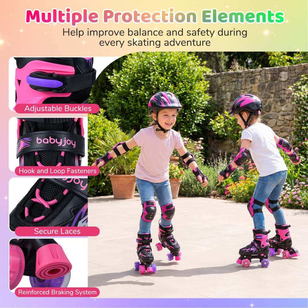 ● Enhanced Safety Design: Designed with multiple protection elements, these kids roller skates include sturdy buckles, hook and loop fasteners, and classic laces for a customized fit. Moreover, the reinforced braking system helps improve balance and safety during every skating adventure.