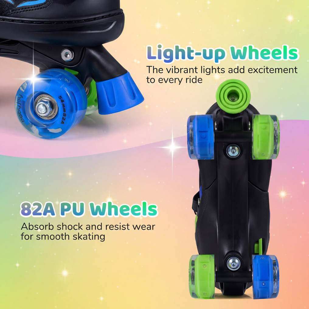 ● Battery-Free Light-Up Wheels: Equipped with motion-activated glowing wheels, these light-up roller skates illuminate with no batteries required. In addition, the vibrant lights add excitement to every ride, whether on neighborhood sidewalks or at the rink, making each outing more enjoyable.